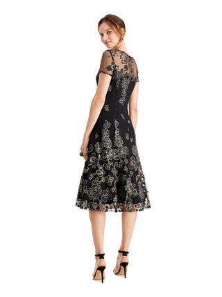 Vestido formal feminino SLNY com zíper e glitter, manga curta, gola alta, corte midi, flare, preto, tamanho 14