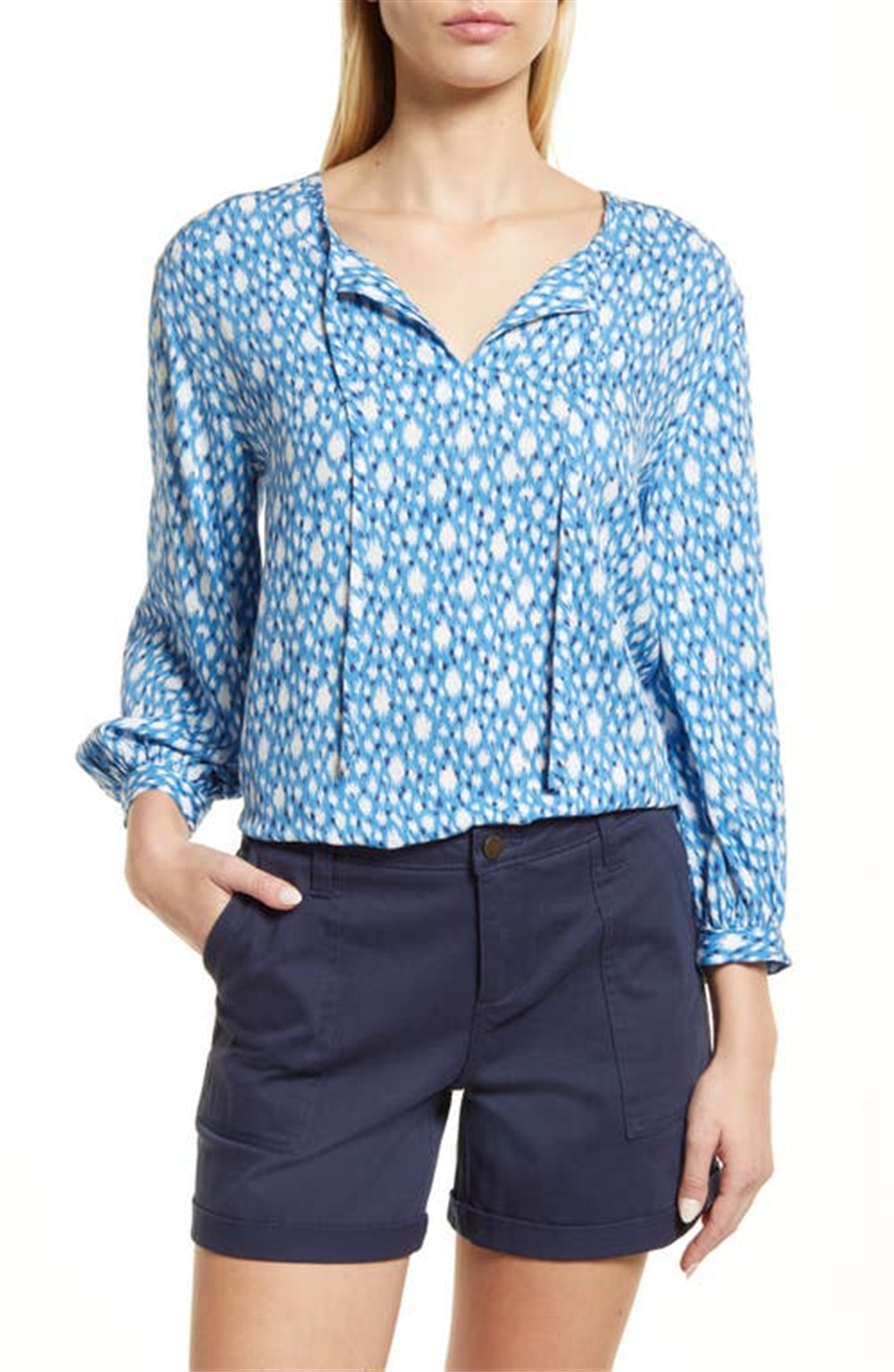 Camisa floral caslon(r) com gola dividida em bolinhas ikat Vallarta azul, tamanho extrapequeno
