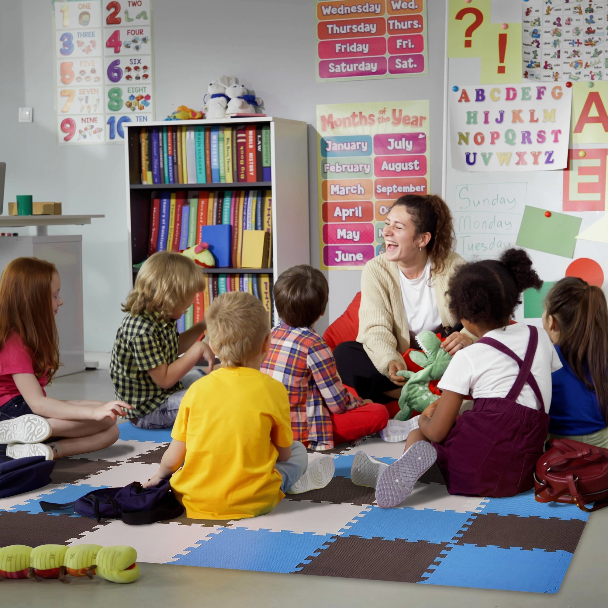 Transforme sua creche, sala de jogos em casa ou programa extracurricular com o tapete de exercícios de espuma EVA BalanceFrom Fitness com 36 peças extra grossas e interligadas.