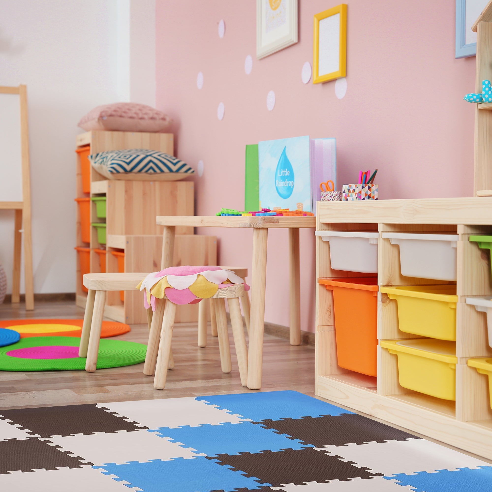 - Com esquema de cores em azul, marrom e bege, este pacote de tapetes interligados cobre até 36 pés quadrados de espaço de jogo, com cada peça medindo 1 pé quadrado