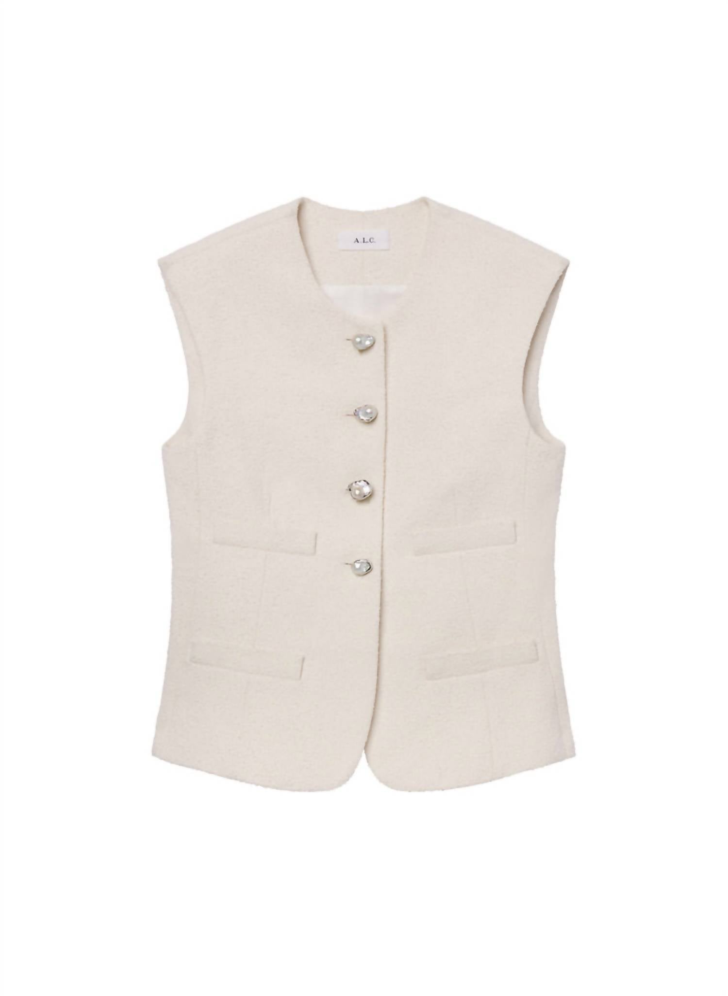 Introducing the Georgie Vest by A.L.C., an elegant piece in a sophisticated pearl hue. This sleeveless vest is crafted from a textured cotton blend, featuring a round neck and welt pockets for a sleek finish. Composition: 93% Cotton, 7% Polyamide. Closure: Unique pearlized button-front closure. Garment Length: About 22.5" from shoulder to hem. Care: Dry clean. Imported.
