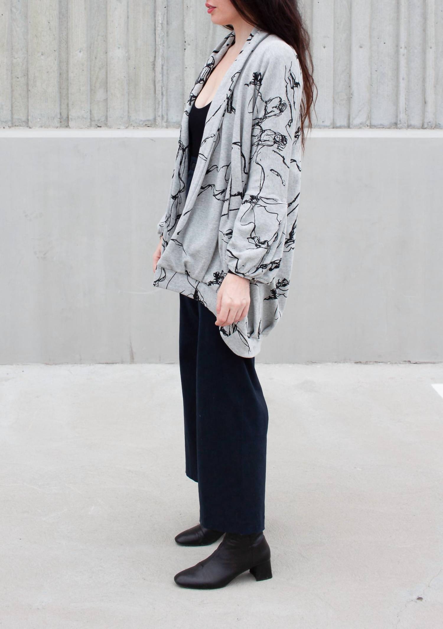 Introducing the Apollo Jacket by Bel Kazan—a stylishly patterned casual jacket in Heather Gray Ardemis. Designed with long sleeves and a flattering V-neckline, this women's jacket stands out for its chic yet comfortable pull-on closure. It makes a perfect statement piece for any wardrobe without the bulk of pockets. For best care, hand wash and lay flat to dry.