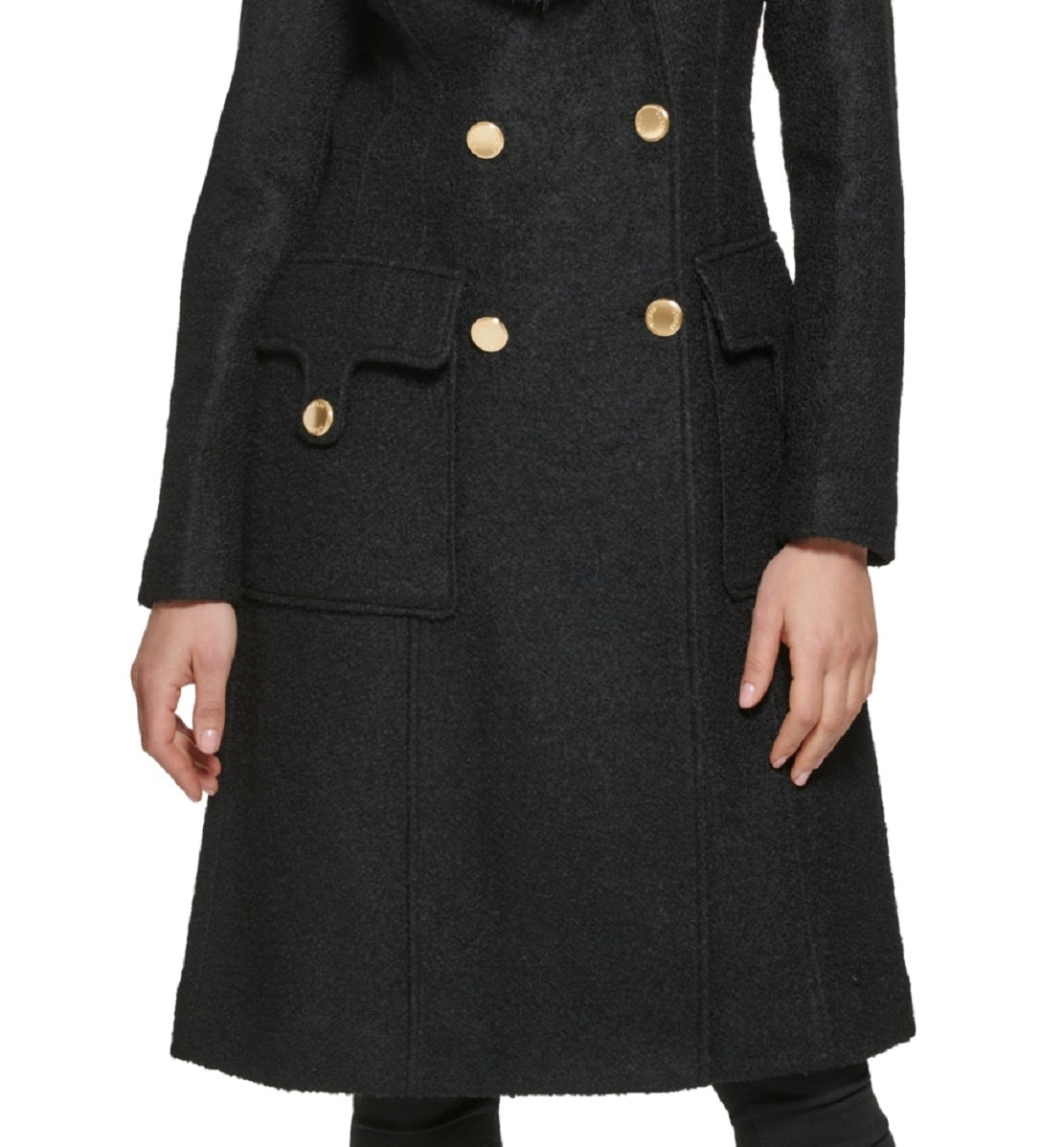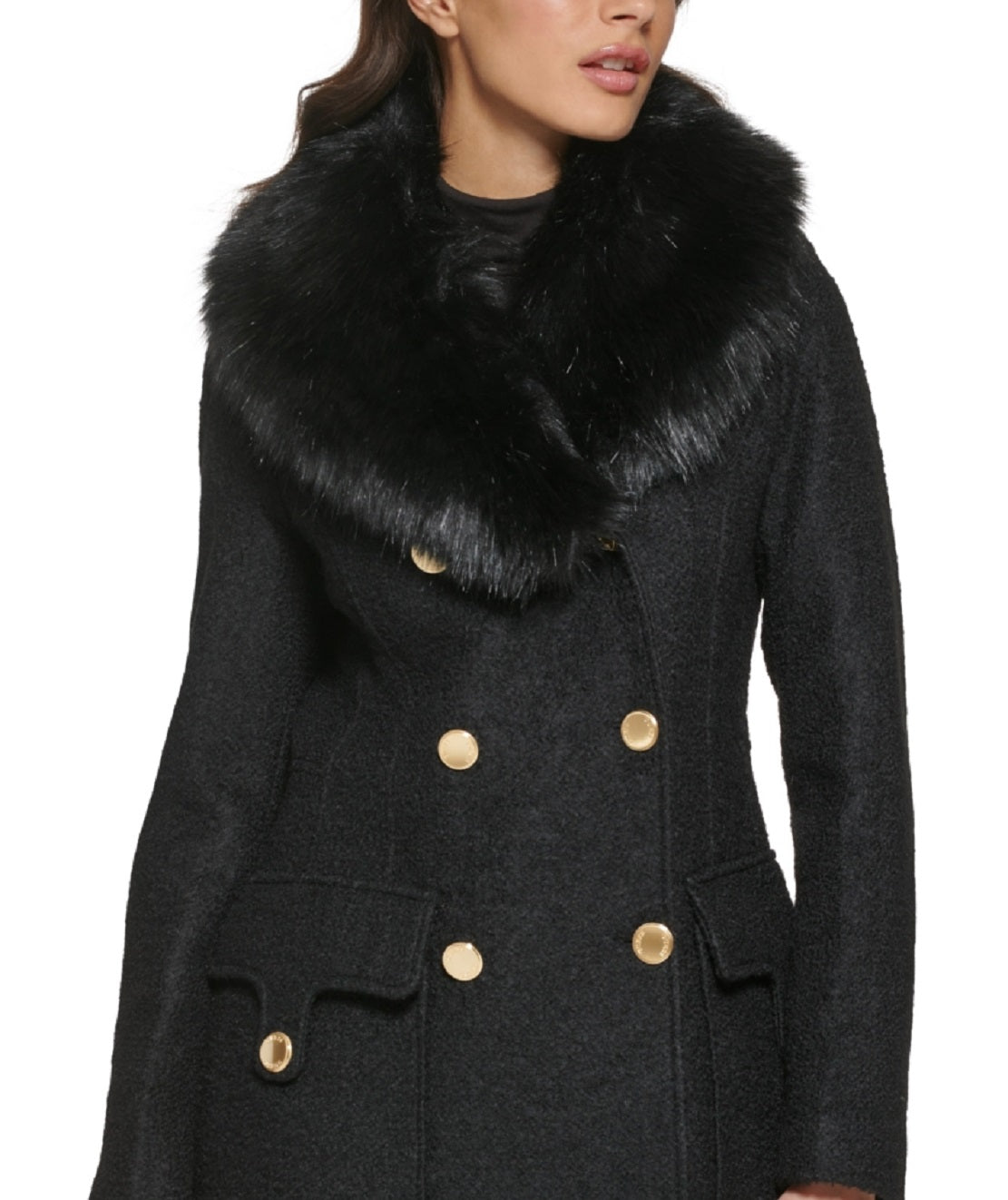 Casaco feminino GUESS com gola de pele sintética e abotoamento duplo, preto, tamanho X-S