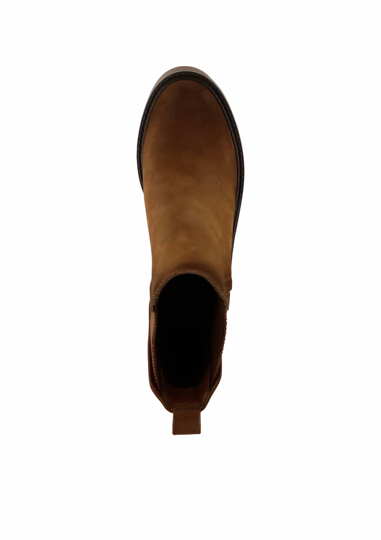 A stylish boot with a comfortable fit and the perfect amount of height. These classic boots are the perfect addition to any outfit and can be worn season after season.Embrace the perfect blend of rugged charm and contemporary style. Crafted from tumbled faux leather in a rich cognac hue. Heeled boots boast a round-toed design. Marries comfort and fashion effortlessly. Elevated on a chic 3.3-inch lugged heel. Provide a sturdy lift while the toothy lug sole ensures grip and stability with every step. Thoughtfully contoured footbed and cushioned insole. Elastic paneling on both sides and a convenient pull-on tab. Guarantee a snug and customizable fit.