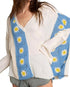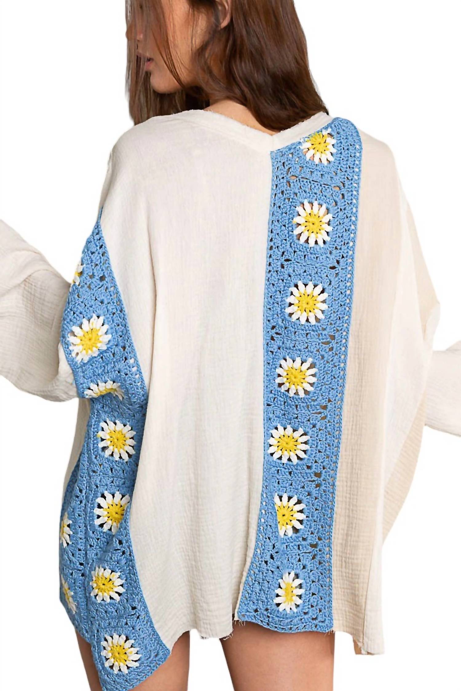 Wear this v-neck sweater with your favorite denim for the perfect fall look.Whimsical blend of vintage charm and contemporary design. Delightful V-neck top features an oversized fit. Ensures both comfort and a relaxed silhouette. Adorned with intricate, hand-stitched granny patch panels. Meticulous craftsmanship and attention to detail. Gauzy material breathes effortlessly. Long bell sleeves add a touch of drama. Floral pattern infuses a sense of timeless femininity into your wardrobe. Made from soft, high-quality cotton. Pull-on sweater is both cozy and stylish. Unique style with the playful yet elegant.