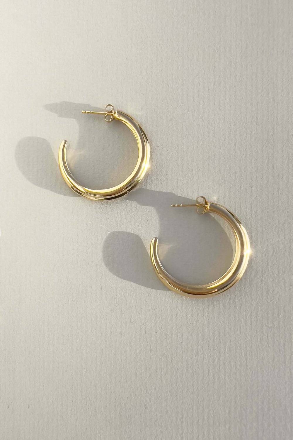 Classic earrings that will take you from season to season. Discover the Crescent Hoops Earrings Large by Astor & Orion, crafted in elegant gold to add a modern edge to your everyday style. These bold hoops, measuring 1.25 inches in diameter, combine the beauty of 18k gold-plated recycled sterling silver. Closure: Post. Perfect for solo wear or paired with medium and small hoops for a layered look, these earrings are ethically made with a focus on sustainability.