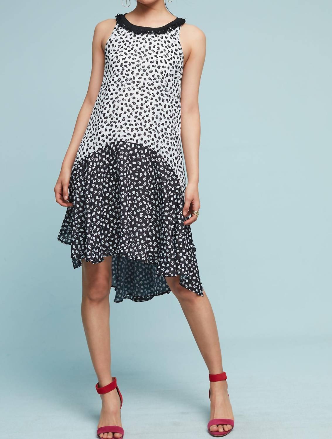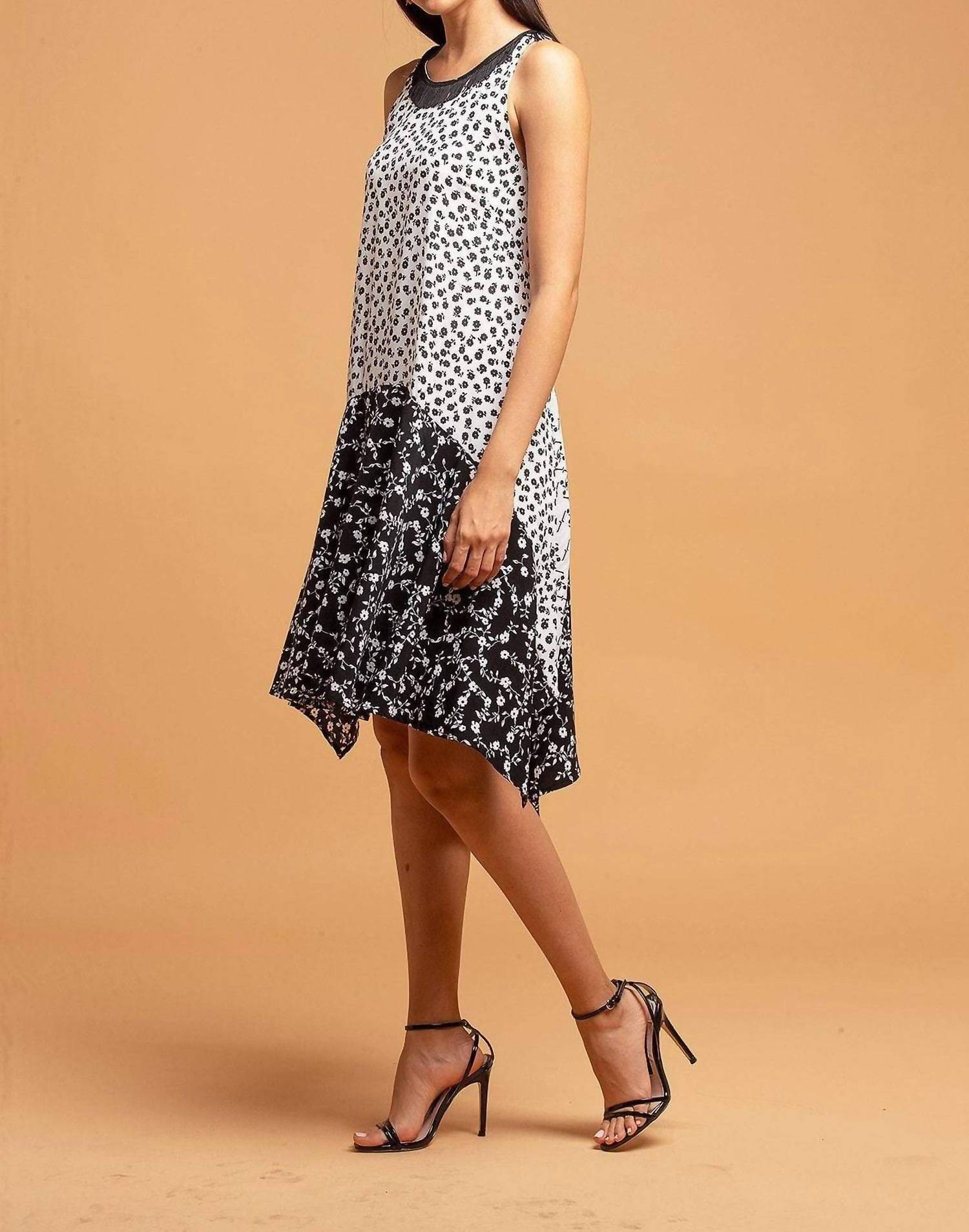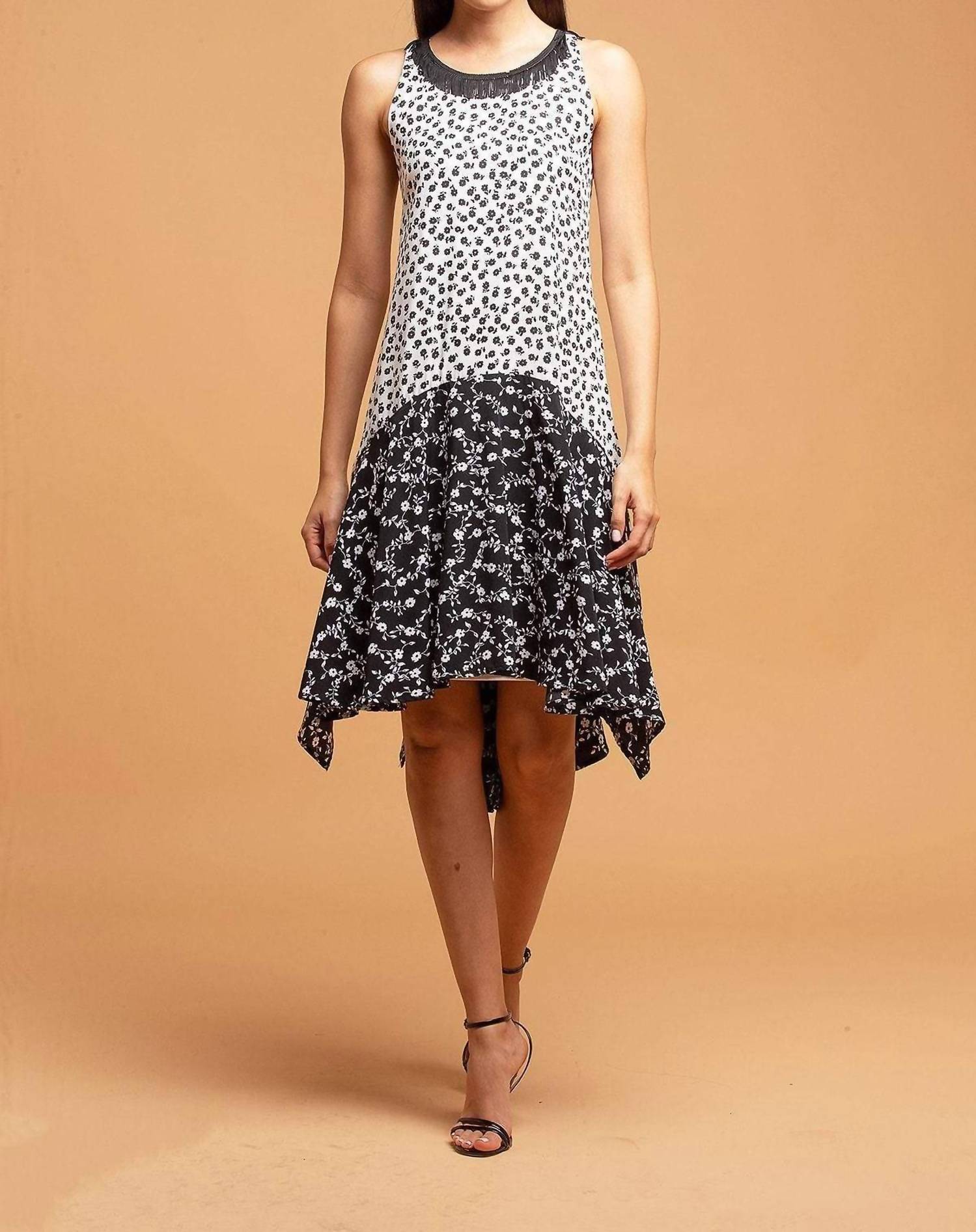 A short and breezy dress for those warmer days. Introducing the Claire Mini Dress by EVA FRANCO, an embodiment of boho chic perfect for any holiday party or event. This sleeveless dress, featuring a scoop neck with playful fringe detail, showcases a fit-and-flare silhouette with a striking floral pattern in black and white. Made from 100% Polyester, it boasts a fully lined interior and a stylish high-low hem, measuring approximately 41 inches long. This piece is crafted with care in the USA and features a convenient zip closure. To maintain its pristine condition, dry cleaning is recommended.