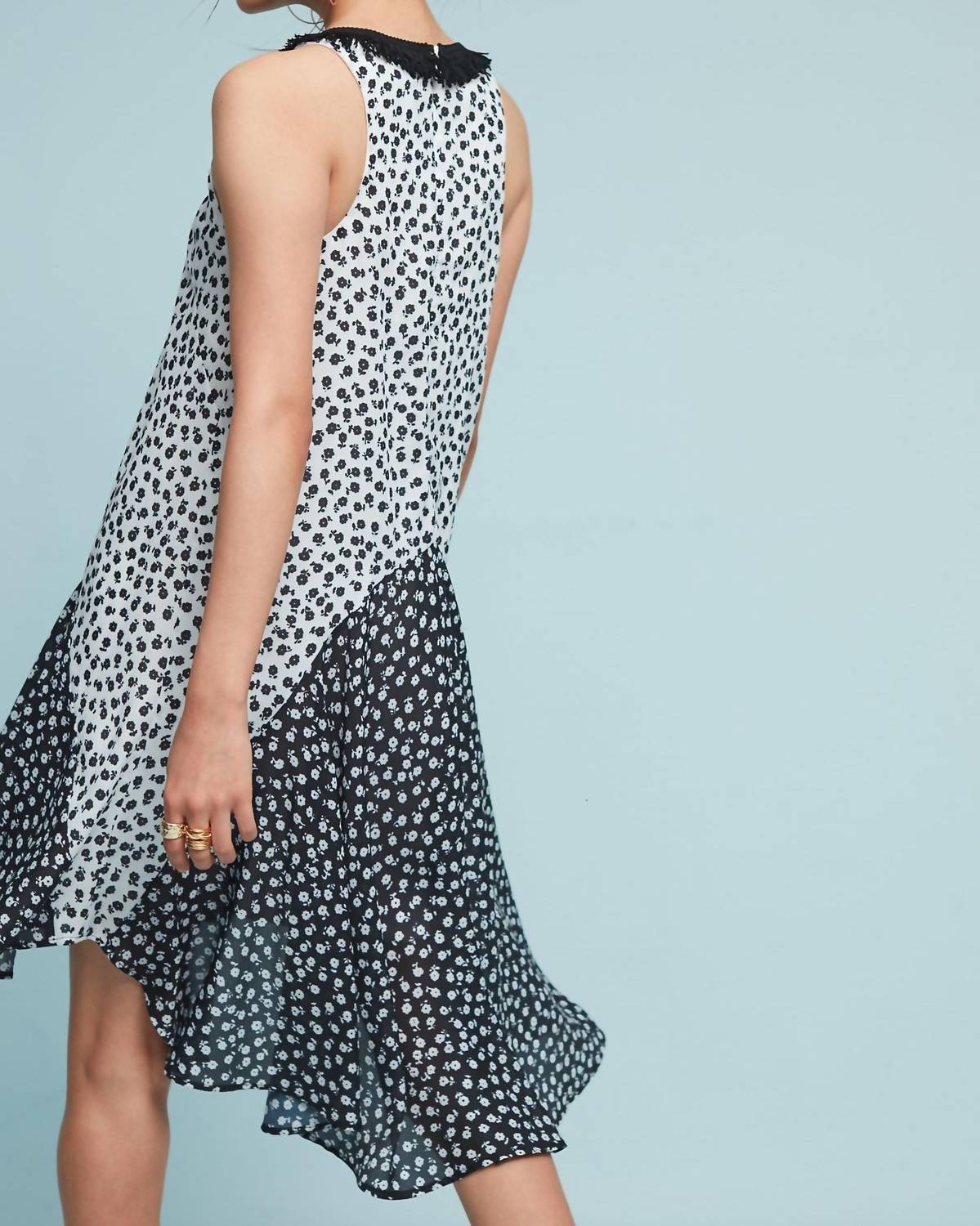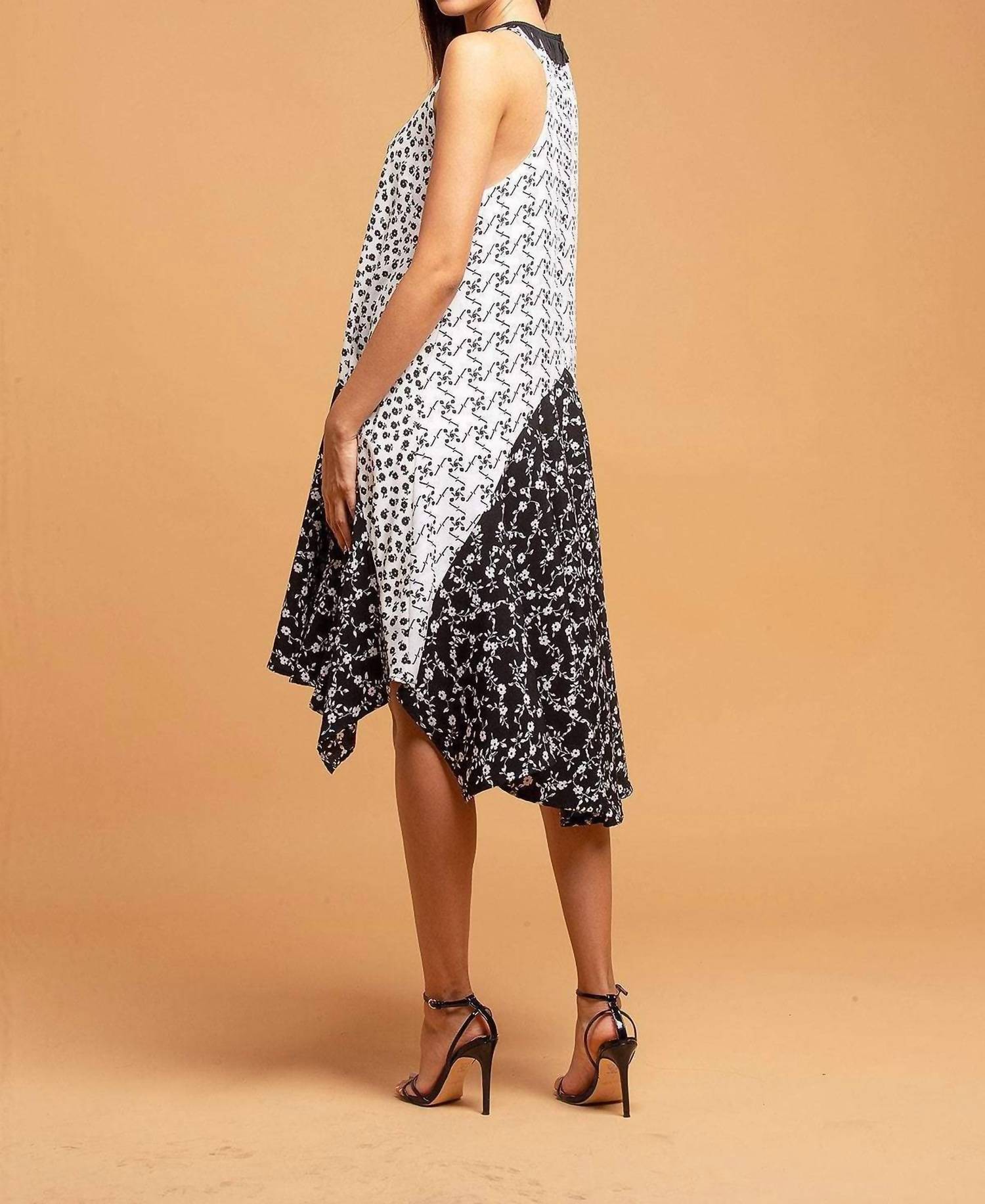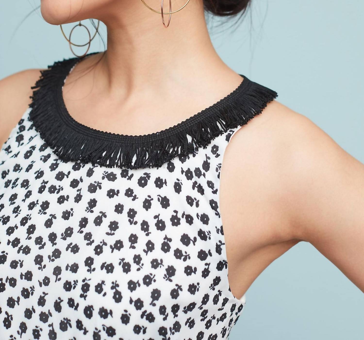 A short and breezy dress for those warmer days. Introducing the Claire Mini Dress by EVA FRANCO, an embodiment of boho chic perfect for any holiday party or event. This sleeveless dress, featuring a scoop neck with playful fringe detail, showcases a fit-and-flare silhouette with a striking floral pattern in black and white. Made from 100% Polyester, it boasts a fully lined interior and a stylish high-low hem, measuring approximately 41 inches long. This piece is crafted with care in the USA and features a convenient zip closure. To maintain its pristine condition, dry cleaning is recommended.