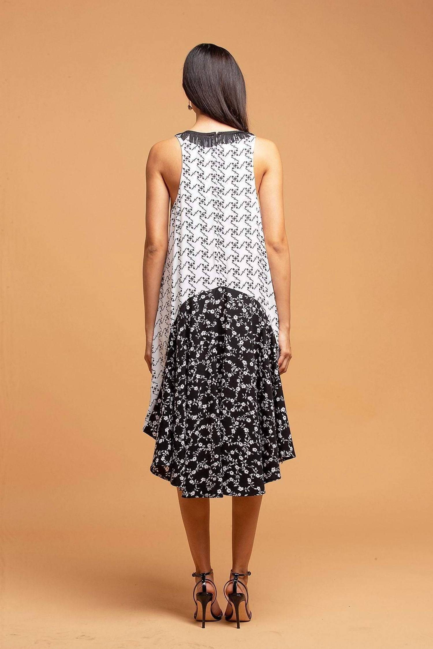 Introducing the Claire Mini Dress by EVA FRANCO, an embodiment of boho chic perfect for any holiday party or event. This sleeveless dress, featuring a scoop neck with playful fringe detail, showcases a fit-and-flare silhouette with a striking floral pattern in black and white. Made from 100% Polyester, it boasts a fully lined interior and a stylish high-low hem, measuring approximately 41 inches long. This piece is crafted with care in the USA and features a convenient zip closure. To maintain its pristine condition, dry cleaning is recommended.