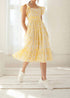 Introducing the Gianna Dress by Guadalupe Design, an effortlessly stylish addition to your summer wardrobe. This women's midi dress, designed in vibrant yellow, features a fit and flare silhouette with cap sleeves and a square neckline. Made with a charming patterned design, it offers practical pockets and a convenient pull-on closure. For care, machine wash as recommended. Perfect for a beach day, it embodies a love for textiles and the unique detailing of Guadalupe's artisanal craftsmanship.