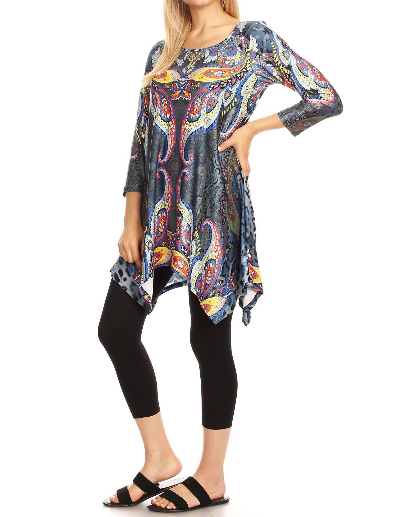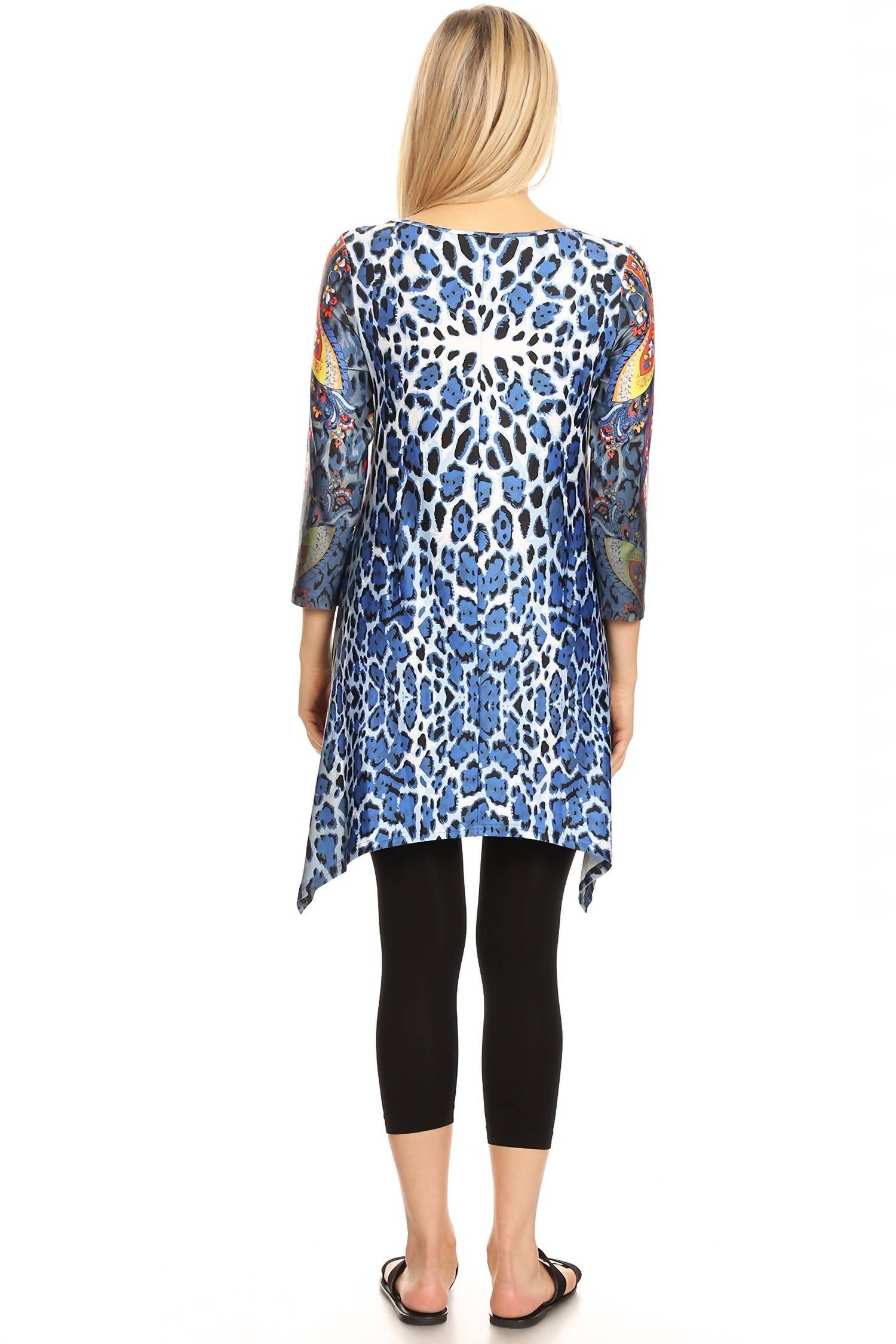 Um complemento perfeito para qualquer guarda-roupa, esta blusa clássica estilo túnica é elegante e prática. Você pode facilmente transitar do escritório para o jantar com esta blusa chique. Esta túnica elegante da White Mark veste maravilhosamente bem. Possui mangas 3/4, estampa paisley e animal print multicolorida, decote redondo e dois bolsos laterais ocultos. Material: 95% poliéster e 5% elastano.