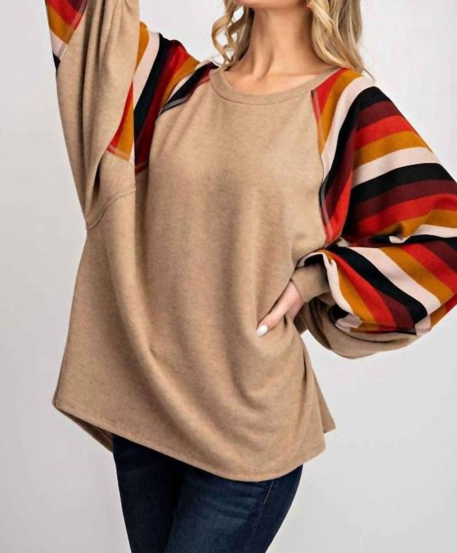 Introducing the Balloon Sleeve Crew Top by 143 Story, a must-have piece with oversized pullover fit and stylish striped contrast dolman balloon sleeves in a soft, cuddly fabric. Perfectly designed for a chic preppy look, this top features a raw seam edge detail in a charming camel hue. Composition: 68% Polyester, 28% Rayon, 4% Spandex. Sleeve Length: Long Sleeve. Care: Dry Clean. Made in USA. With a length of 30" and a bust that fits approximately 34-36-38, this piece is ideal for fall occasions, including New Year's Eve celebrations and anniversaries.