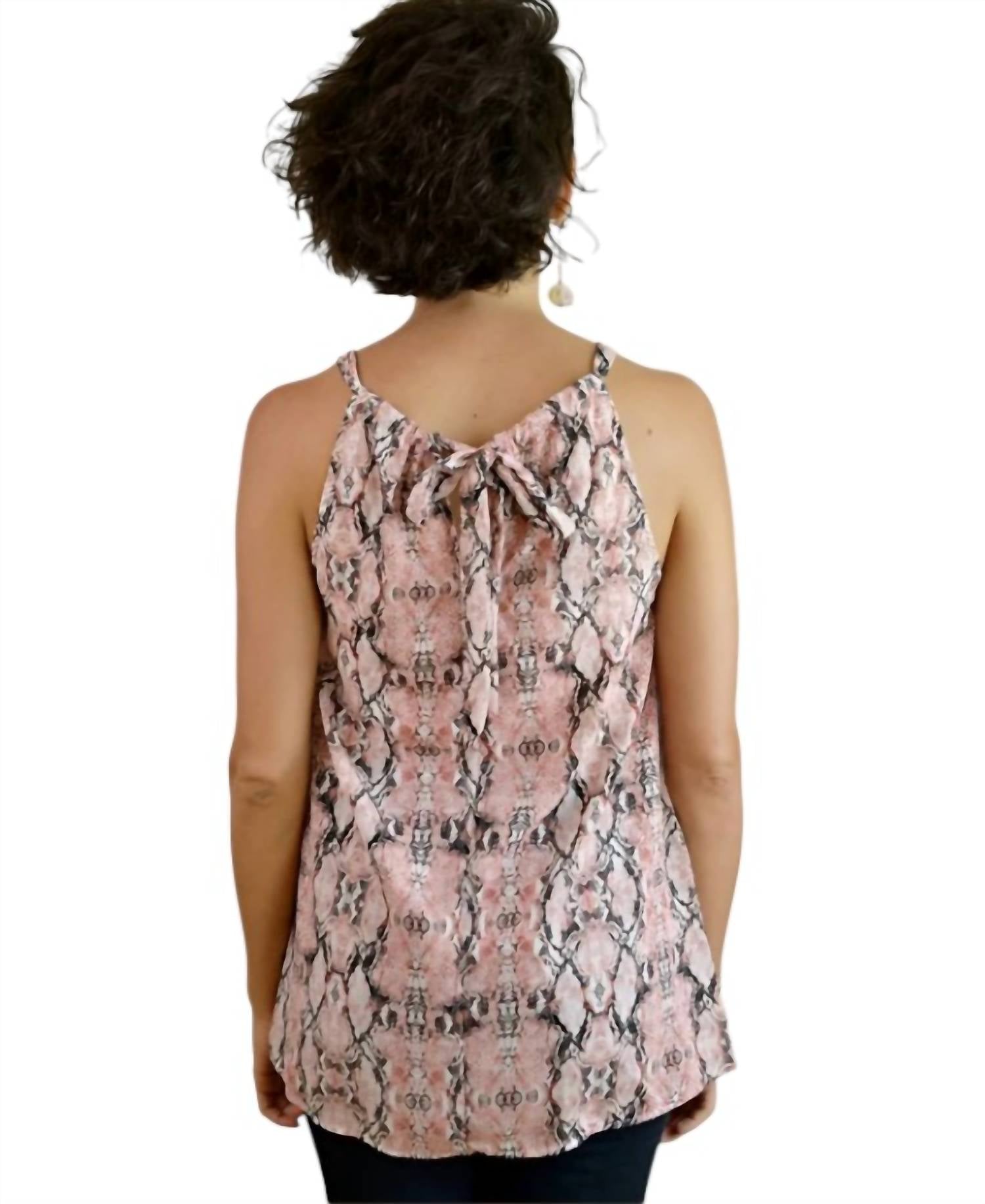 Introducing the Python Halter Tie Back Blouse by 143 Story, a statement piece in a captivating rose-colored python snake print. This sleeveless top is crafted from 100% polyester wool dobby fabric and features an adjustable halter tie with a back bow tie for a personalized fit. With a flattering rounded hem, its length is 29" in a size small, ideally suiting bust sizes 34-36-38. Made in the USA, it is recommended to hand wash cold or dry clean, and line dry for best care.