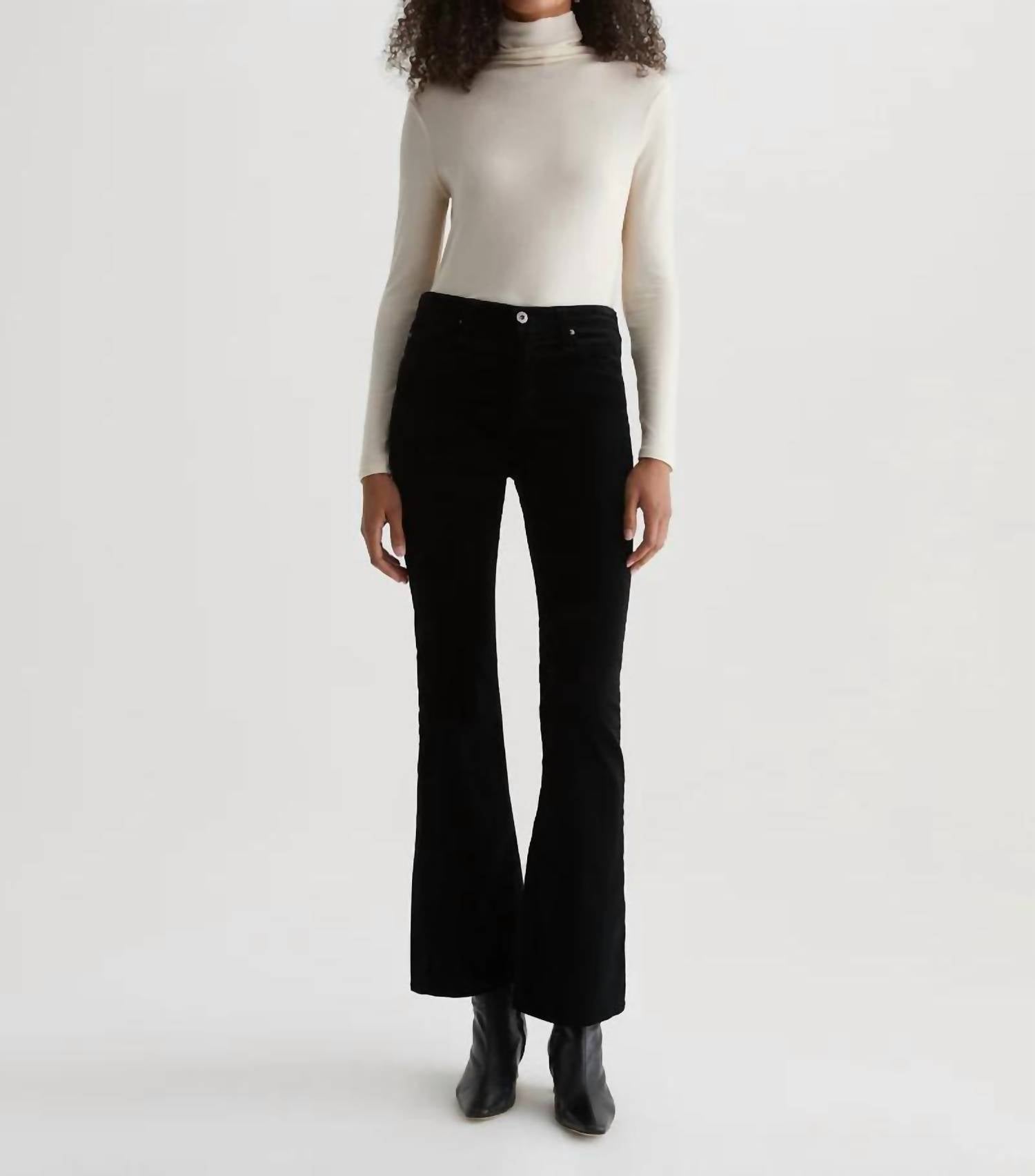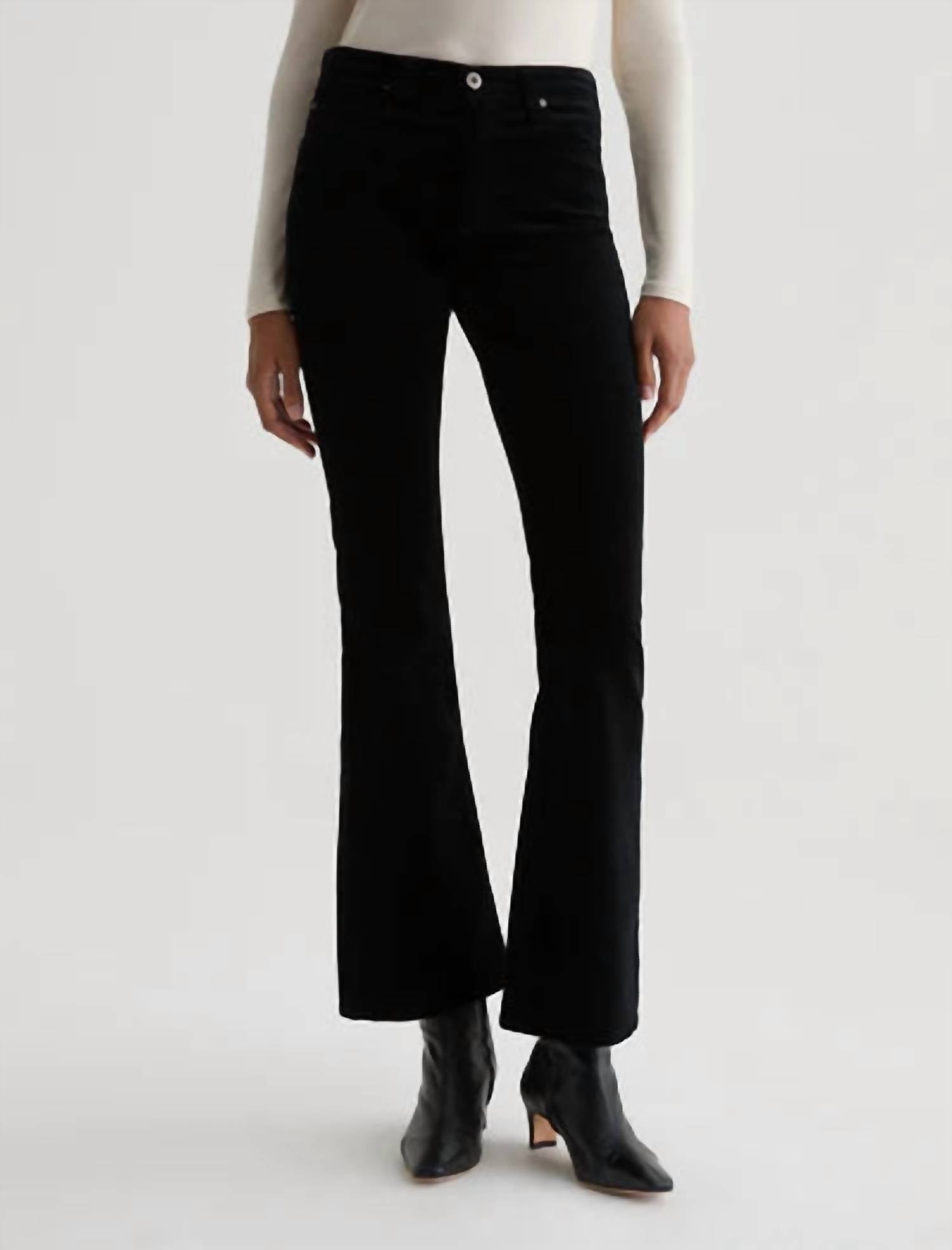 Just as cute as they are comfortable. Introducing the Velvet Farrah Boot Mid Rise Jeans by AG Jeans, a chic addition to your wardrobe in ultra-dark Super Black. These jeans are crafted from an 8 oz. Soft Plush Stretch Velvet, comprising 70% Cotton, 28% Viscose Rayon, and 2% Spandex, ensuring comfort with every wear. The mid-rise jeans feature a skinny fit through the leg that elegantly opens into a flared hem, complemented by practical pockets and a button closure. Fit details include a 10" front rise, 14" knee opening, 18 1/2" bottom opening, and 32" inseam. Care for these jeans with machine washing and laying flat to dry, making them a perfect choice for a stylish dinner party. Model is wearing a size 25.