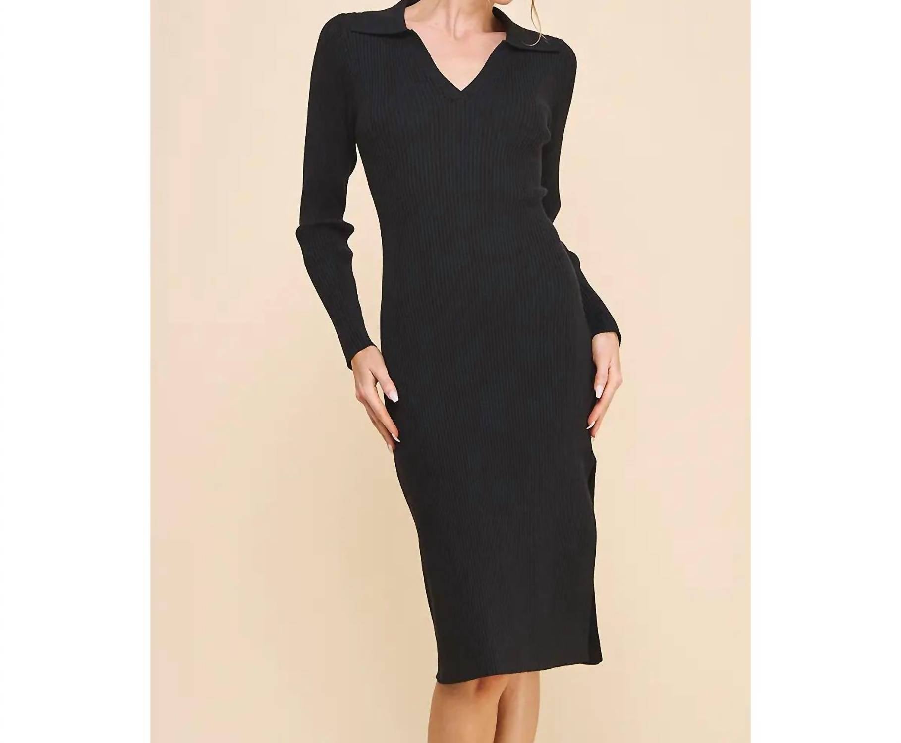 Introducing the Ribbed V Neck Collar Long Sweater Dress by Allie Rose, a sophisticated choice in sleek black with a tailored fit. Featuring long sleeves, this mid-weight bodycon dress flaunts a flattering V-neckline and a stylish side slit. Closure: Side zipper. Care: Hand wash and line dry for best results.