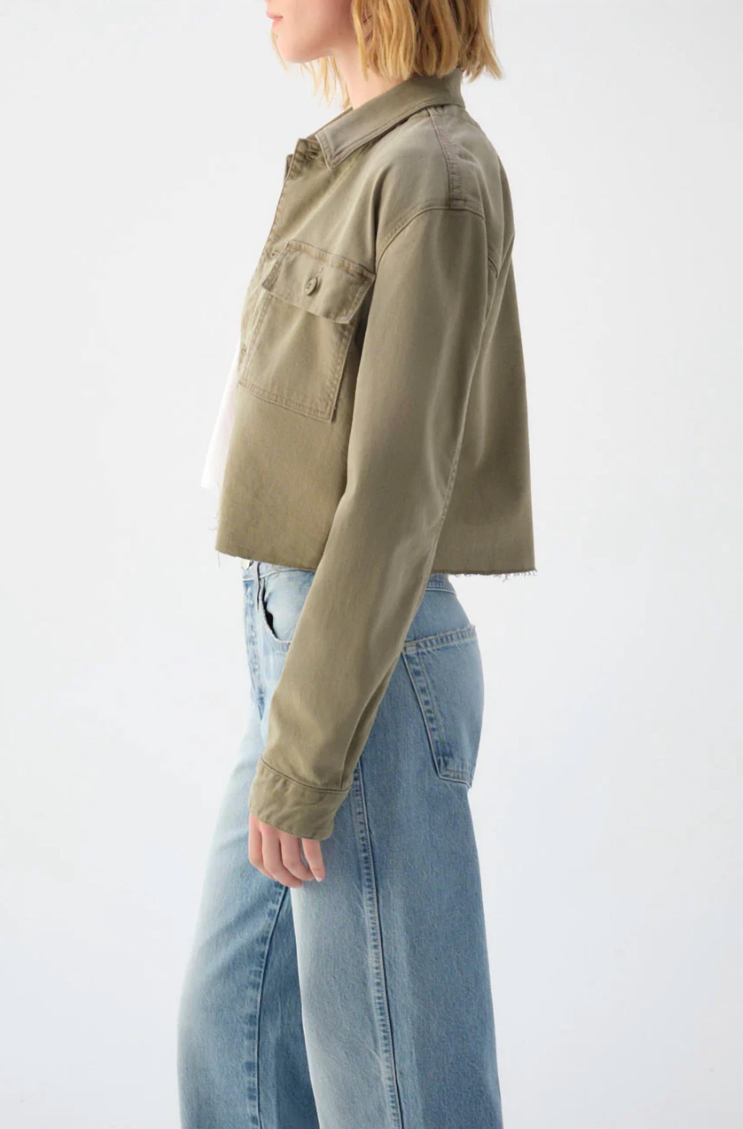 Meet the Carly Jacket by AMO, a standout in Surplus color, perfect for a minimalist's wardrobe. This utility jacket features long sleeves and a button closure, crafted from a comfortable cotton blend of 70% Cotton, 29% Lyocell, and 1% Elastane. With its cropped, raw hem design and functional front patch and flap pockets, it offers both style and practicality. Care is simple with machine wash cold instructions, making this jacket a versatile staple for all-year-round wear.