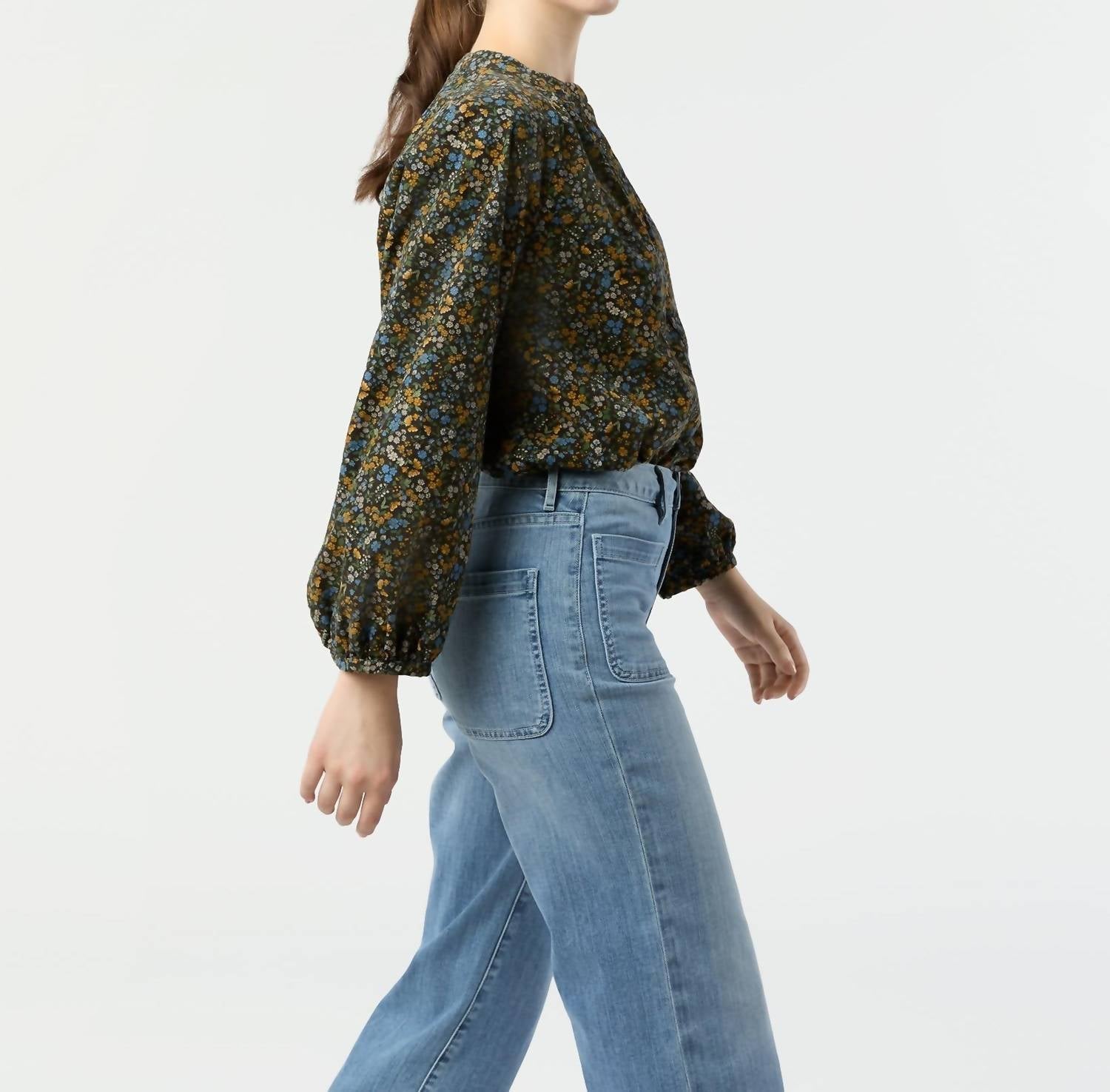Enhance your wardrobe with the chic Sienna Top by Ann Mashburn, a boho-inspired blouse in a striking navy and multi-color floral pattern. Crafted from 100% Japanese corduroy cotton, this piece features three-quarter length gathered sleeves and a pleated neckline, adding an elegant touch to any ensemble. Made in Vietnam, it showcases smoke mother-of-pearl buttons and a covered popover placket with French seams for a seamless finish. Care is straightforward: machine wash cold, hang dry, and iron on low reverse to maintain its quality. Model is 5'9" and wearing a size S.