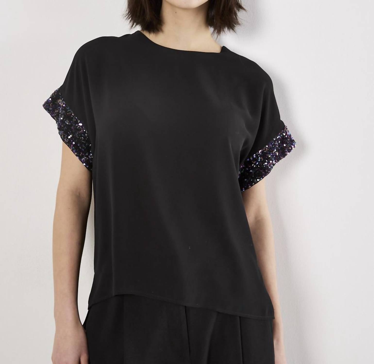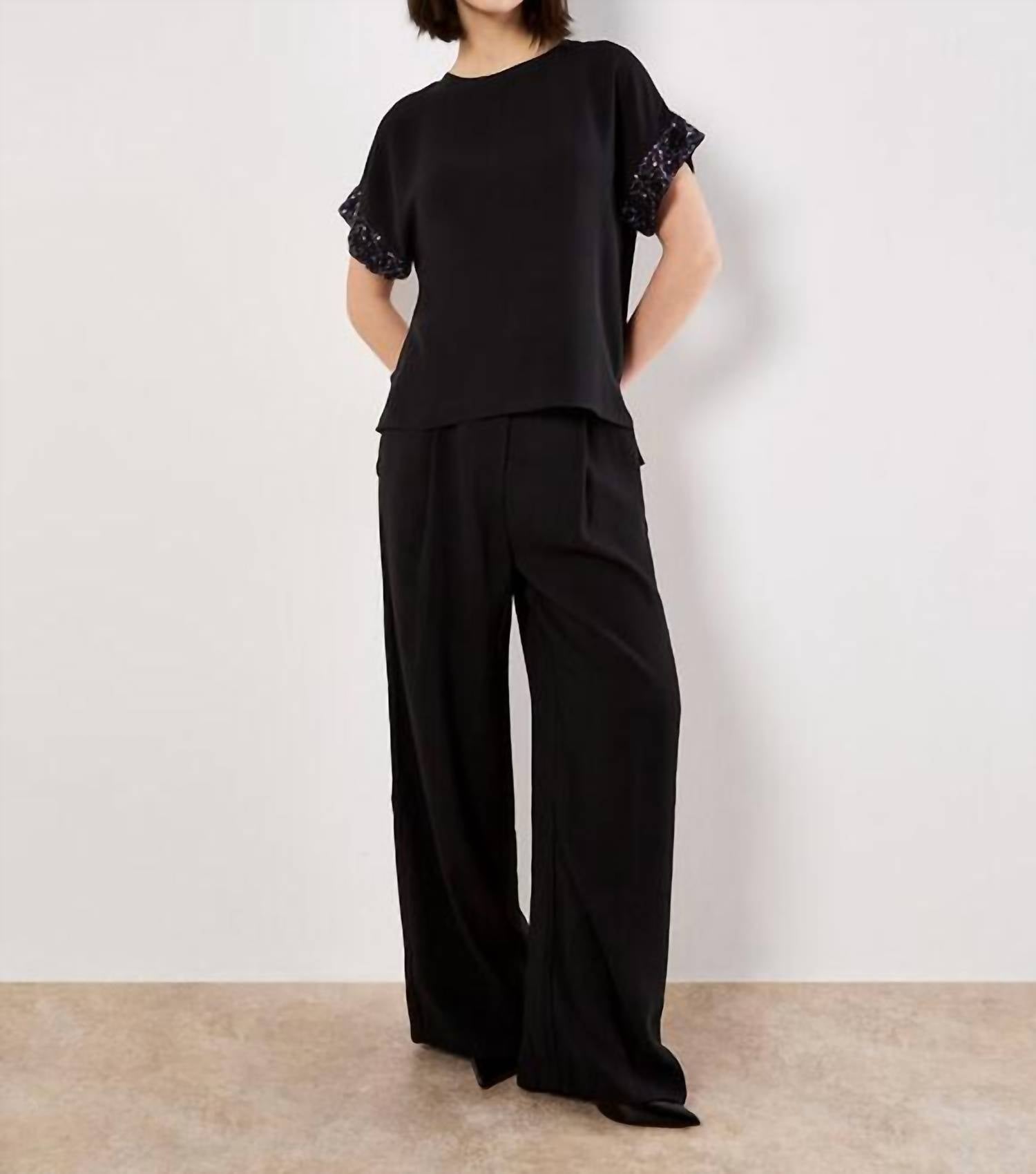 The Sequin Cuff Chiffon Blouse by APRICOT elevates your eveningwear with a touch of sophisticated sparkle. This classic blouse features short sequin-embellished sleeves and a crewneck, crafted from a synthetic blend of polyester for a lightweight feel. Designed with a keyhole closure, it measures approximately 26.378" in length for a versatile fit. Care is easy with machine wash instructions and line dry guidance. Model is wearing a size XS/UK 8 and stands at 5' 8.5".