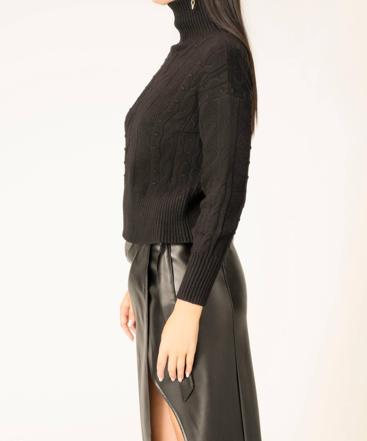 Elevate your winter wardrobe with the Sophie Cable Center Knit Sweater by Area Stars in classic black. This long-sleeve sweater features an intricate cable-knit design with a luxurious turtle neckline, offering both texture and sophistication. Composition: 49% Viscose, 28% Polyester, 23% Nylon. It is tailored for women who cherish both style and comfort. Care: Dry clean only. Ideal for Thanksgiving and vacation occasions, it fits perfectly into the monochrome trend.