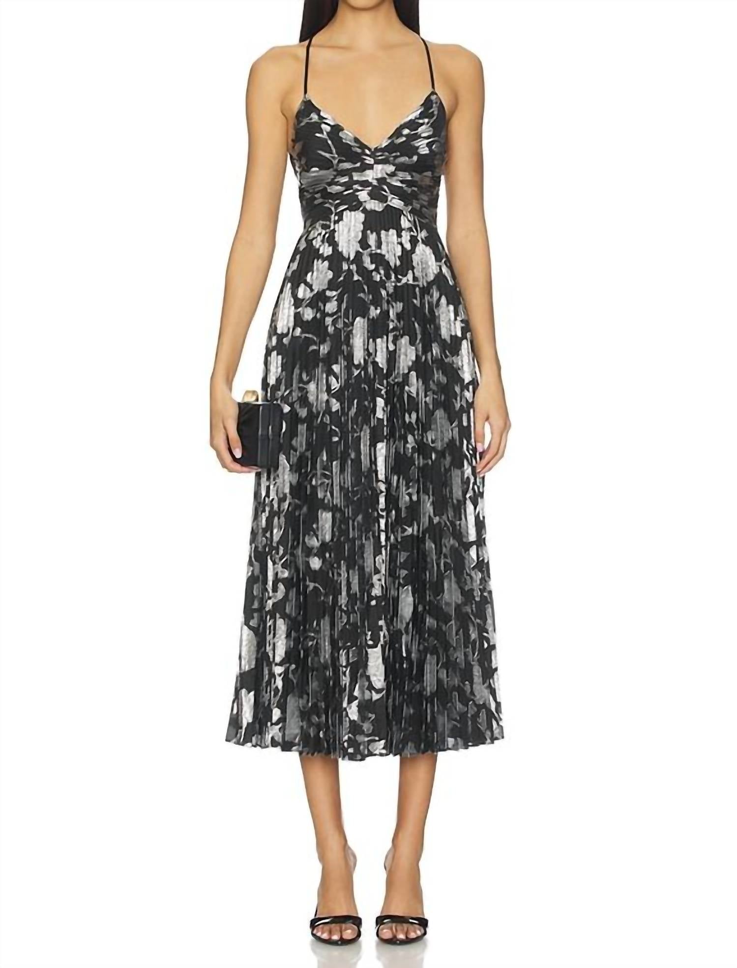 Introducing the Saoirse Pleated Midi Dress by ASTR, a standout piece in Black Silver ideal for weddings and celebrations. This dress features adjustable crisscross spaghetti straps and a V-neckline with a horizontally pleated bust for a touch of elegance. Made from 100% Polyester with a concealed zip closure, the dress promises graceful movement with its allover pleats. Designed for a memorable occasion, the dress requires dry clean care and includes a partial lining that stops at the knees.