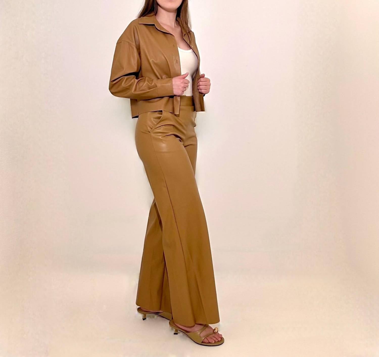 Experience the chic touch of the ASTRID Amelia Faux Leather Pant in Camel, a must-have for sophisticated streetwear. These pants are crafted from exquisite faux leather, offering a classic fit with a straight leg style, perfect for spring vacation outings. The design includes a cinched elastic waistband for comfort, complemented by a zip closure and functional front slant pockets for practicality. Embrace the luxurious allure and elevate your fashion game with this versatile piece.