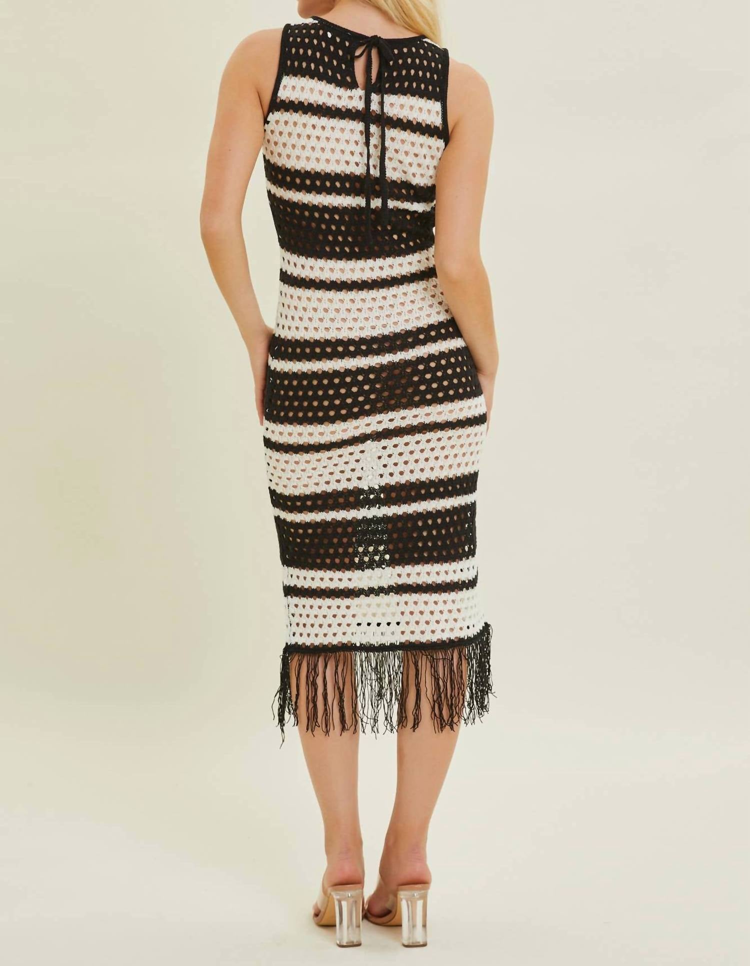 Introducing the Cabana Chic Open Knit Midi Dress by Baevely by Wellmade, a sleeveless, bohemian masterpiece in striking black and ivory. Crafted from a textured fabric, this bodycon silhouette offers a crewneck design perfect for summer vacation vibes. With its stylish fringe detail and convenient tie closure, it seamlessly blends form and function for a beach-ready look. Model is wearing a small size.