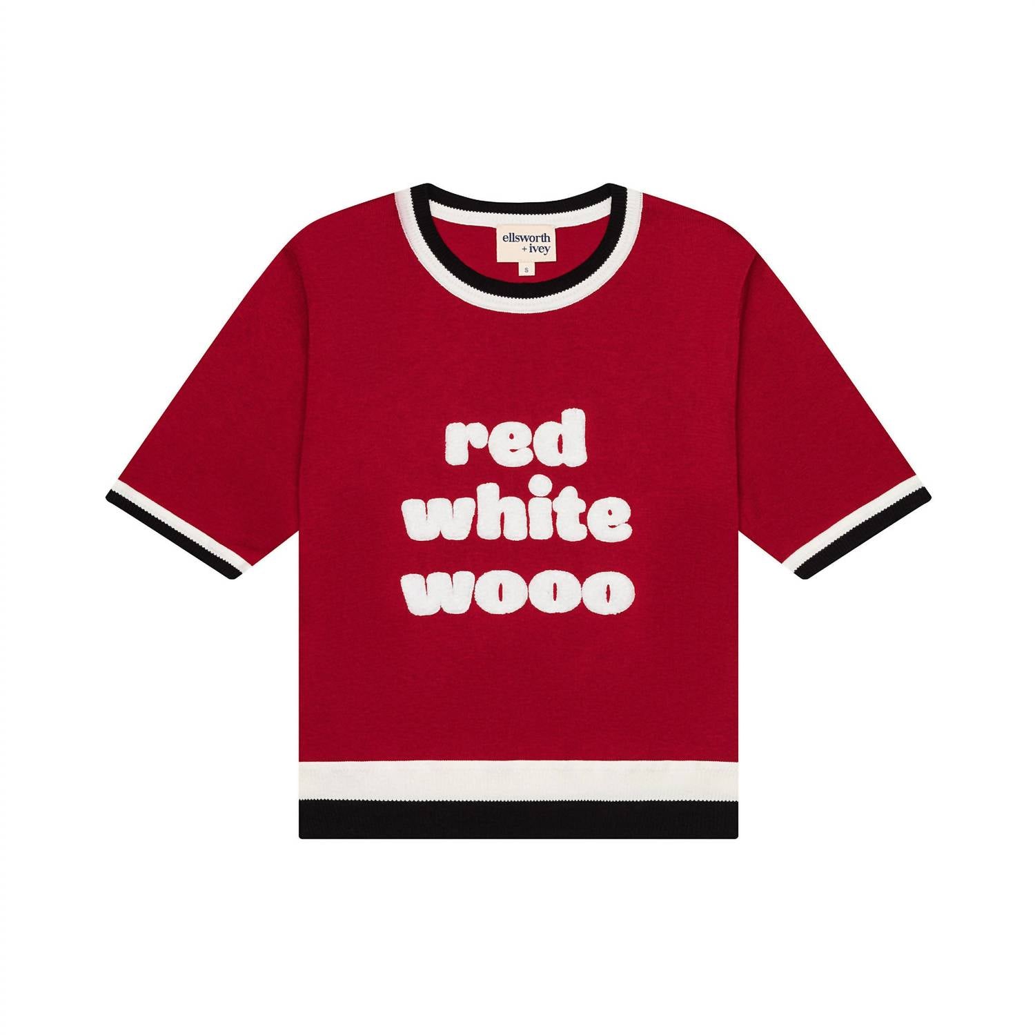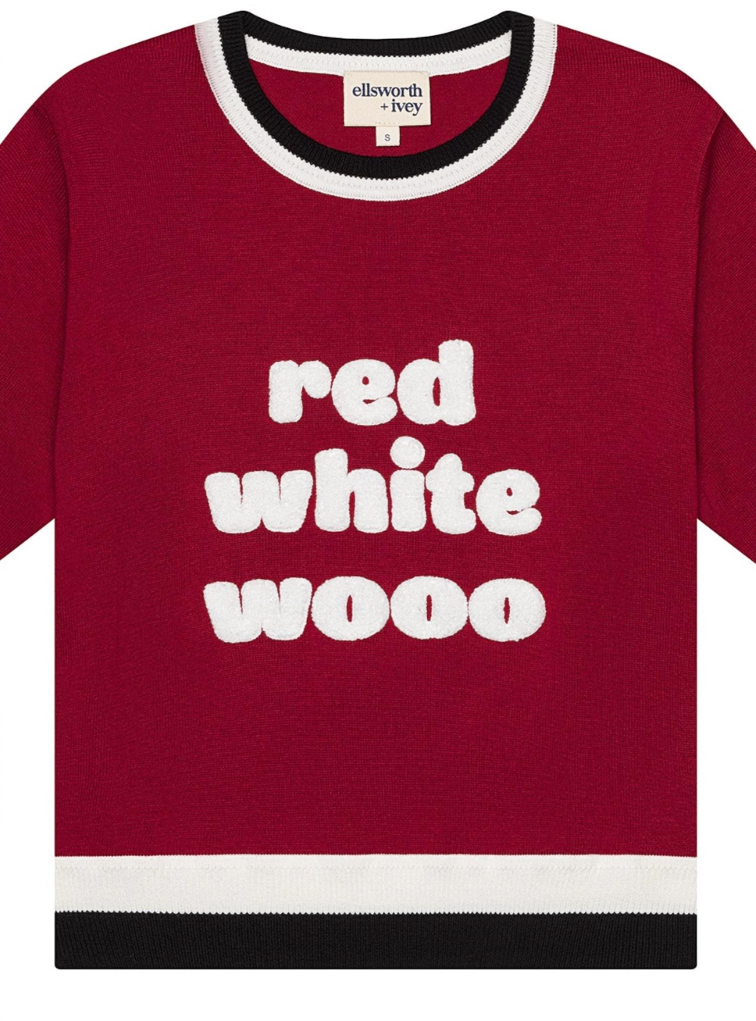 Embrace a stylish statement with the Women's Red White Wooo Short Sleeve Top by Ellsworth + Ivey. Perfect for a summer vacation, this top combines streetwear vibes with graphic prints in vibrant red and ivory. Designed with a crewneck and crafted from acrylic, it offers a comfortable and trendy pull-on style. Care is simple with hand washing, followed by line drying, ensuring this piece stays fresh throughout the season.