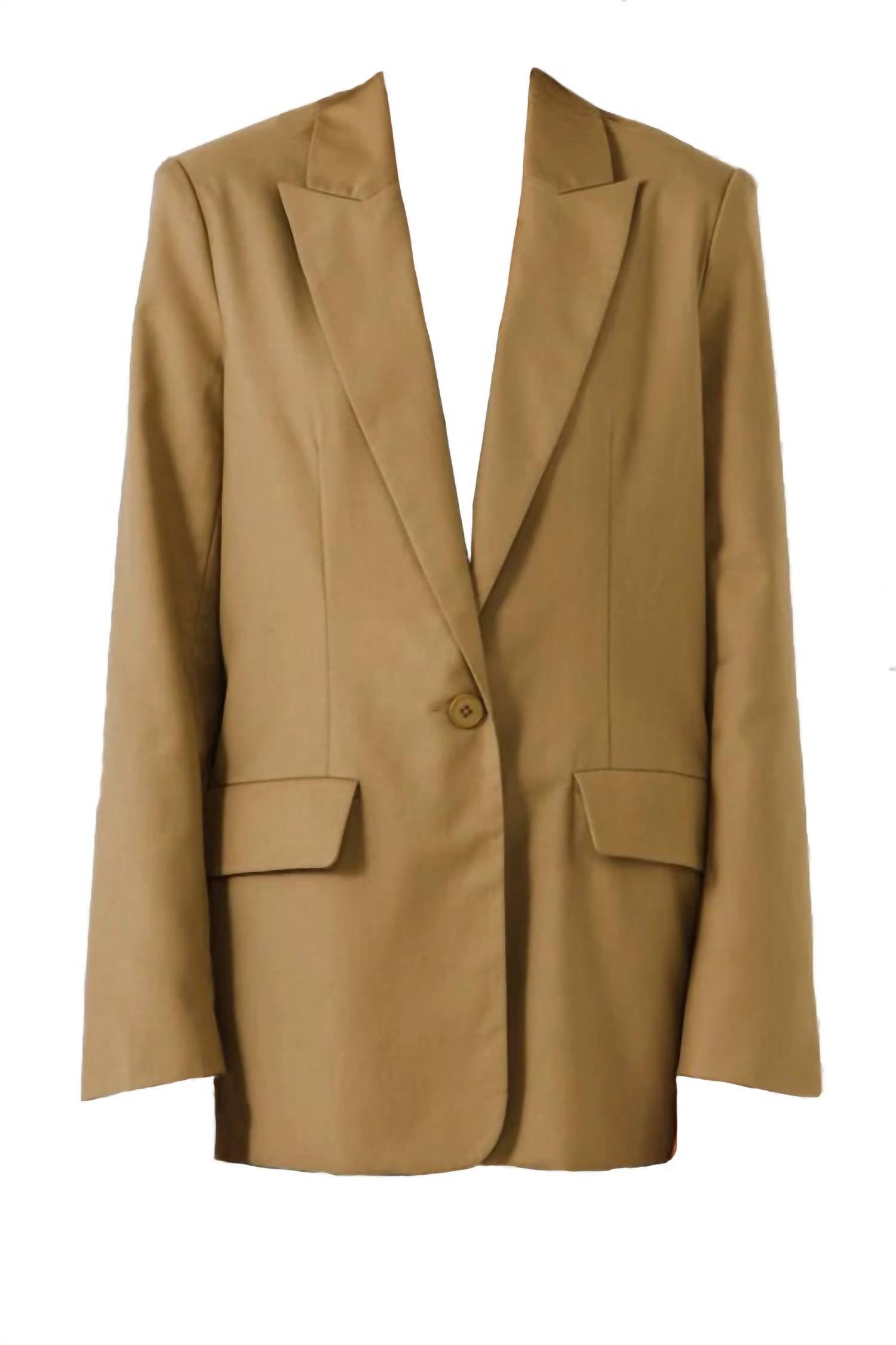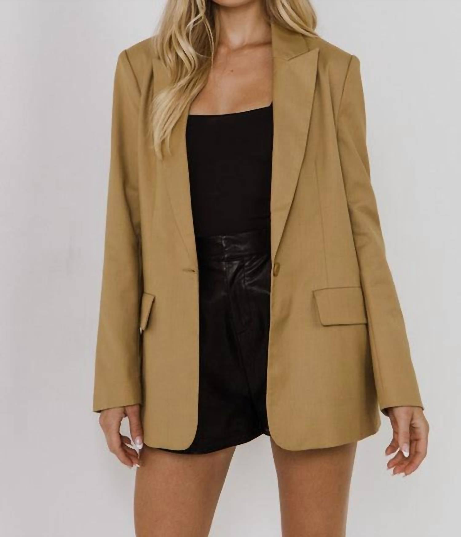Introducing the Single Breasted Long Sleeve Blazer by endless rose, a quintessential piece in sophisticated camel that embodies timeless style. This blazer is expertly tailored with a button closure and features a relaxed fit, perfect for transitioning from office to weekend looks. Crafted from a blend of 75% polyester and 25% rayon with a full polyester lining, it measures a total length of 29.5 inches and a bust of 39.5 inches. Care advice is to machine wash and lay flat to dry, ensuring it remains a staple in your wardrobe for years to come. Model is wearing size XS (Height: 5’8”, Bust: 32”, Waist: 25”, Hip: 35”).
