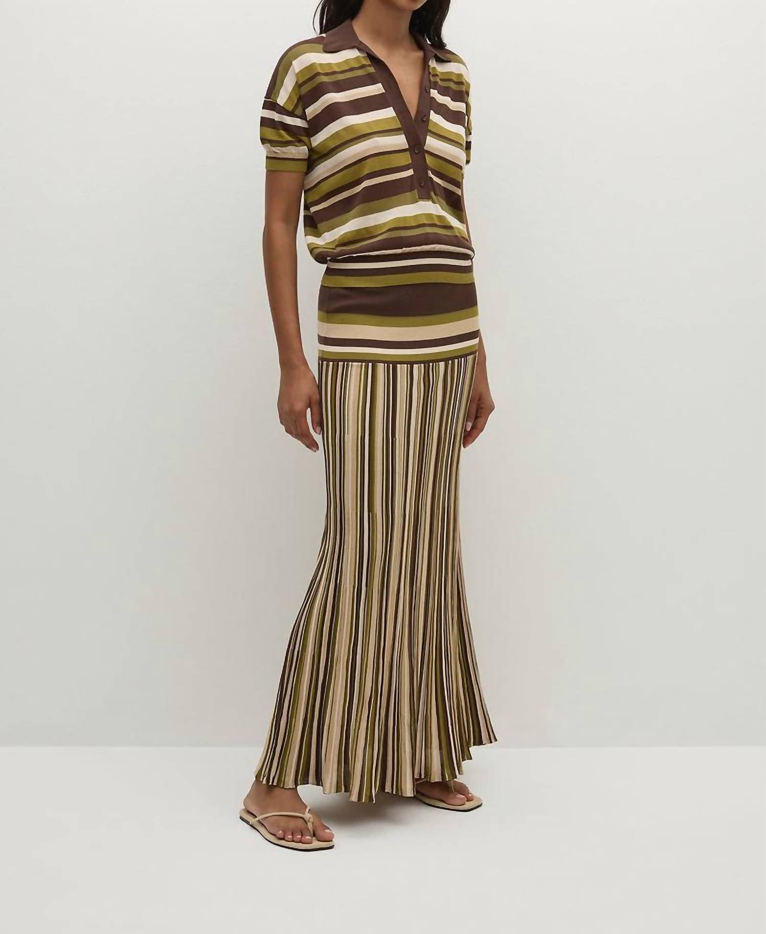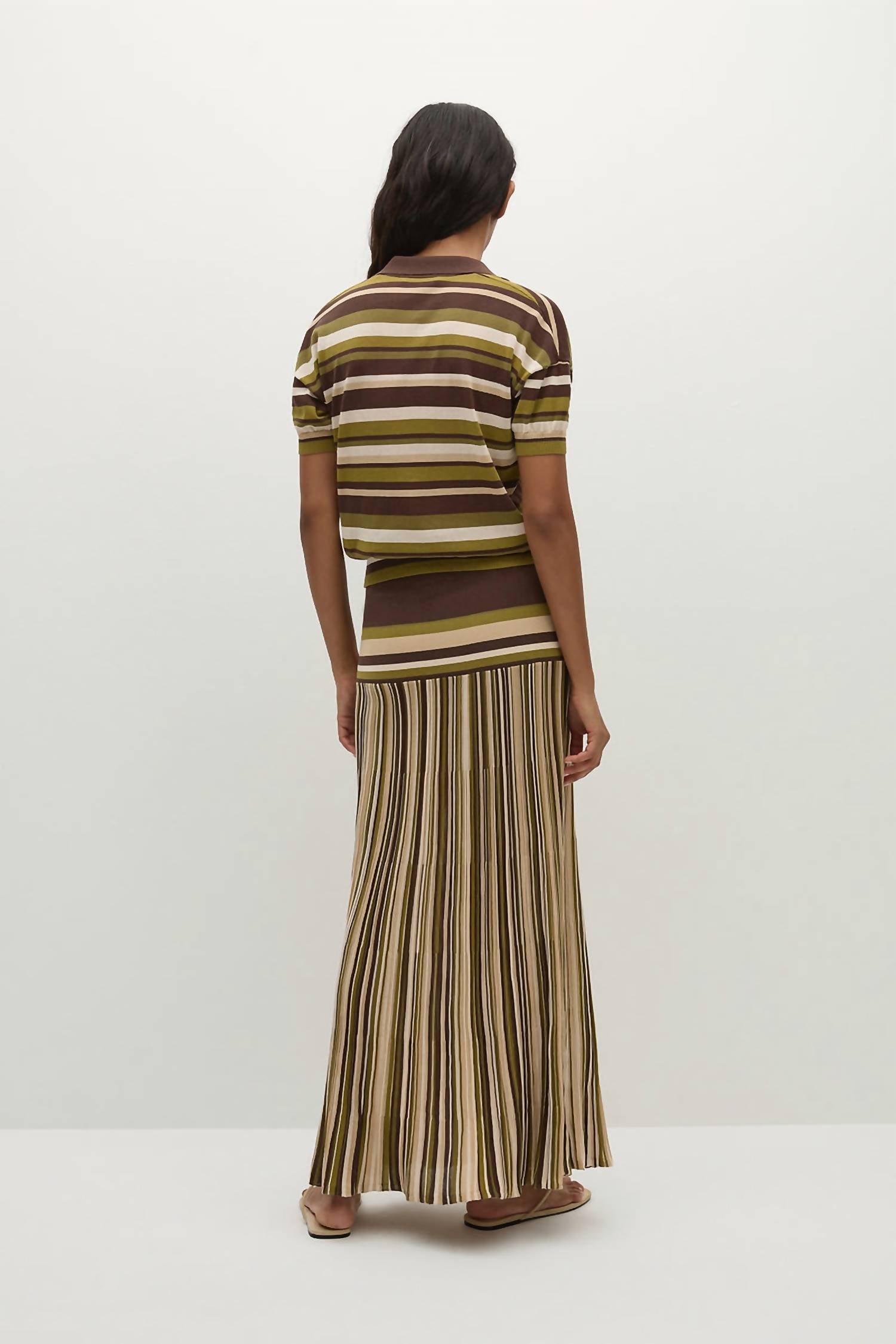 Elevate your wardrobe with the Citara Maxi Skirt by FAITHFULL THE BRAND in an exquisite Espresso Pine Stripe. This women's maxi skirt boasts a pull-on closure and features a unique ribbed knitwear fabrication crafted from a cotton blend, ensuring both style and comfort. The skirt sits mid-rise with an elasticated waistband and a slightly flared silhouette that crops just above the ankles. Perfect for spring holiday parties, care for this boho chic piece by hand washing and laying it flat to dry.
