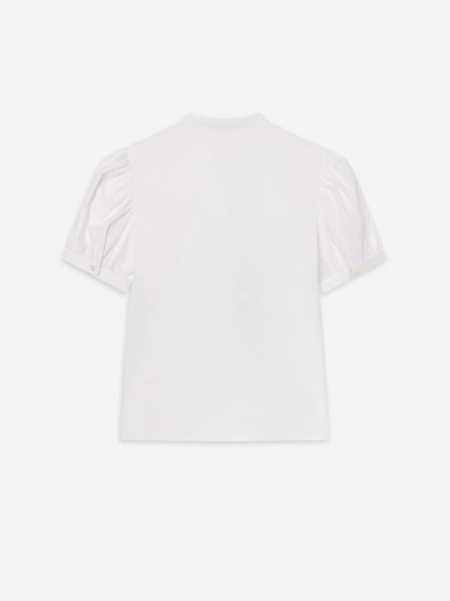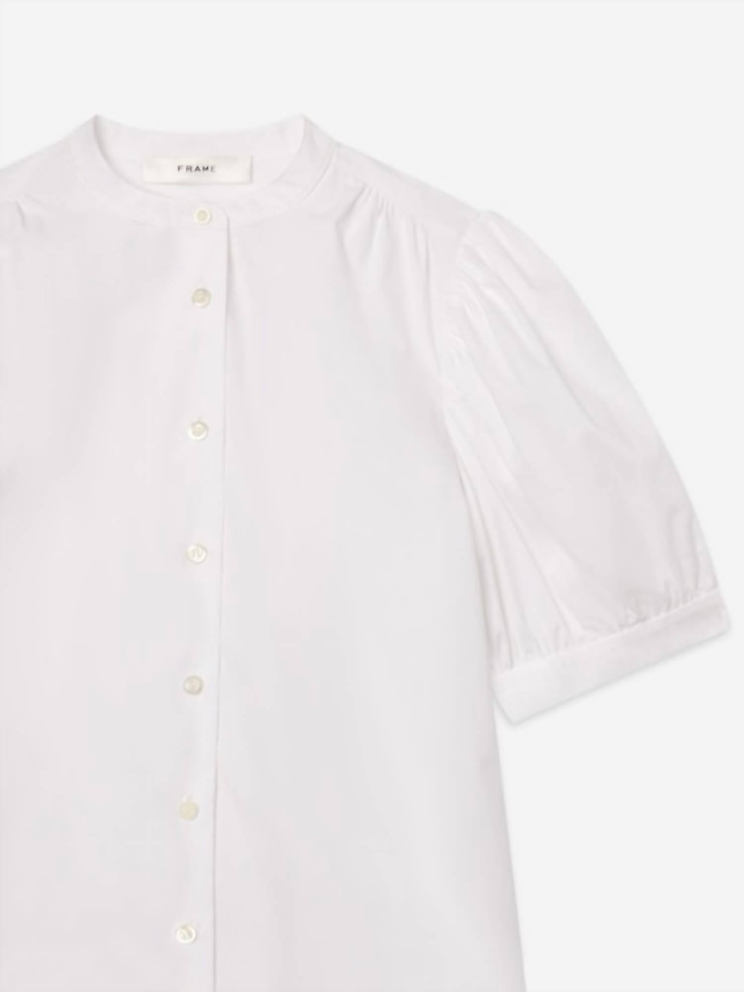 Introducing the Gathered Puff Sleeve Top by FRAME, a chic and feminine addition to your wardrobe in pristine white. Crafted from soft cotton, it features short puff sleeves enhanced by gathered detailing and a polished stand collar. With a length of 24 inches, this blouse has a button closure for easy wear. Care is simple with machine wash instructions, making it a perfect minimalist piece for spring and holiday parties.