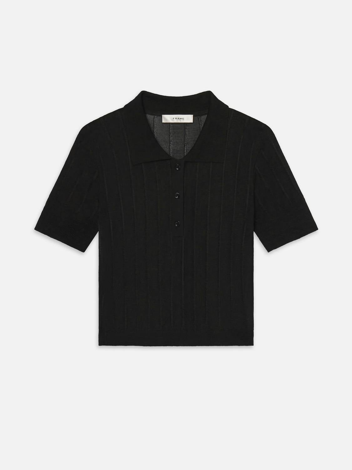 Elevate your wardrobe with the Ribbed Short Sleeves Cropped Polo Shirt by FRAME in timeless black. This short-sleeve polo is crafted from 100% viscose, featuring fine vertical ribbing for a flattering close-fit silhouette. Measuring 18 inches long from the shoulder, it is slightly sheer and perfect for layering or wearing alone. Closure: Button placket. Care: Dry clean only.