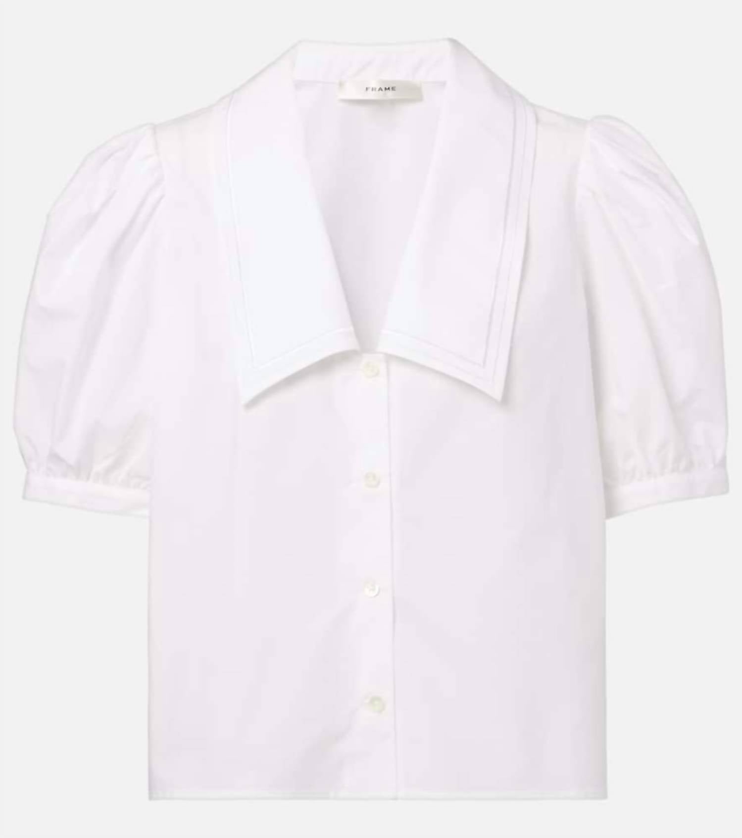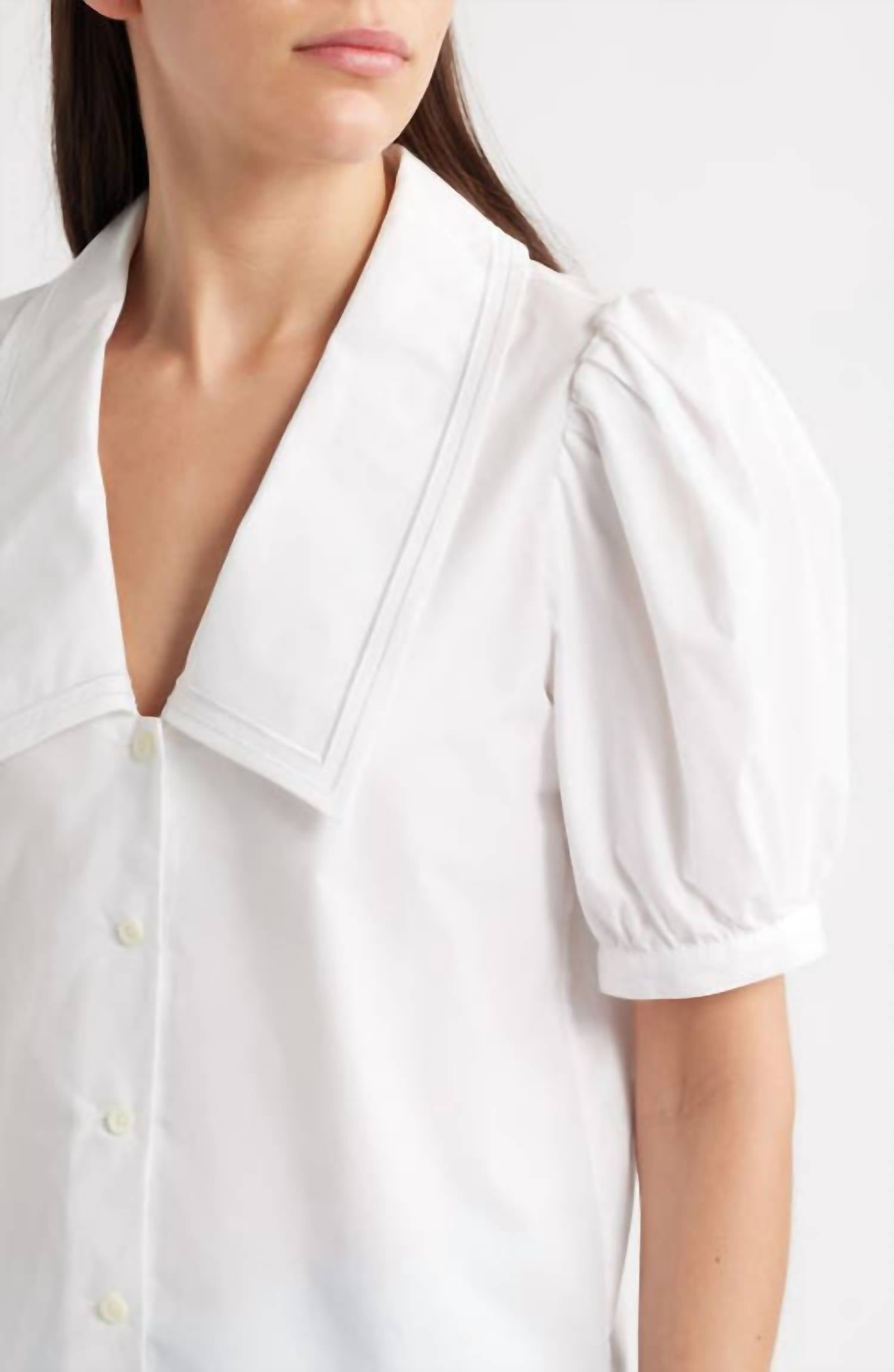 Elevate your wardrobe with the FRAME Sailor Puff Sleeve Blouse, a chic addition perfect for spring parties and holiday festivities. This white short-sleeve blouse is crafted from 100% cotton, featuring an oversized collar and a captivating V-neckline. With pleated sleeves and a romantic silhouette measuring 22.375 inches in length, this piece offers a feminine, minimalist appeal. Closure: Button closure. Care: Dry clean only.