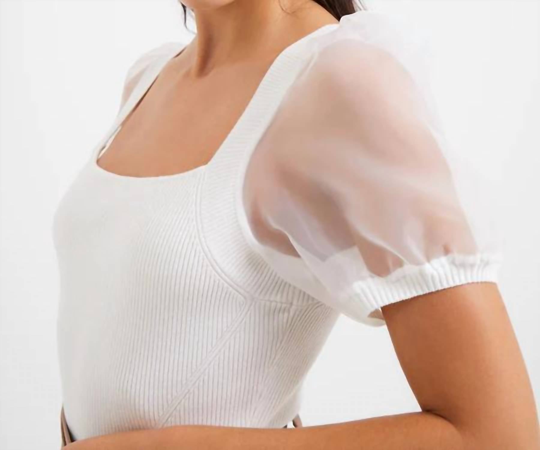 A sheer fashion front-runner for the season. Our Lex Krista Organza Knit Sweater combines textures for a sleek and chic style. Designed with a square neckline framed soft knit bodice accompanied by a pair of voluminous puff sleeves in a sheer organza finish.