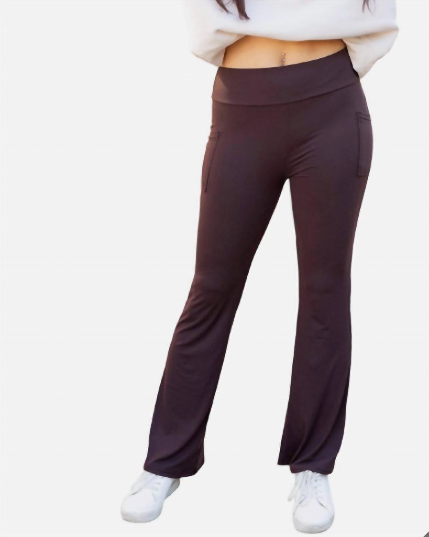 Leggings you can dress up or down for any occasion. Introducing the Rhea Bootcut Leggings With Pockets by Julia Rose, crafted for a chic and comfortable workout ensemble. These brown regular-fit leggings are made of 92% polyester and 8% spandex, ensuring flexibility with a mid-rise, pull-on design. The solid pattern combined with a bootcut leg style effortlessly complements your fitness wardrobe. Featuring practical pockets, these must-have leggings are available in various sizes with inseams ranging from approximately 30" to 31", tailored to elevate your activewear collection.