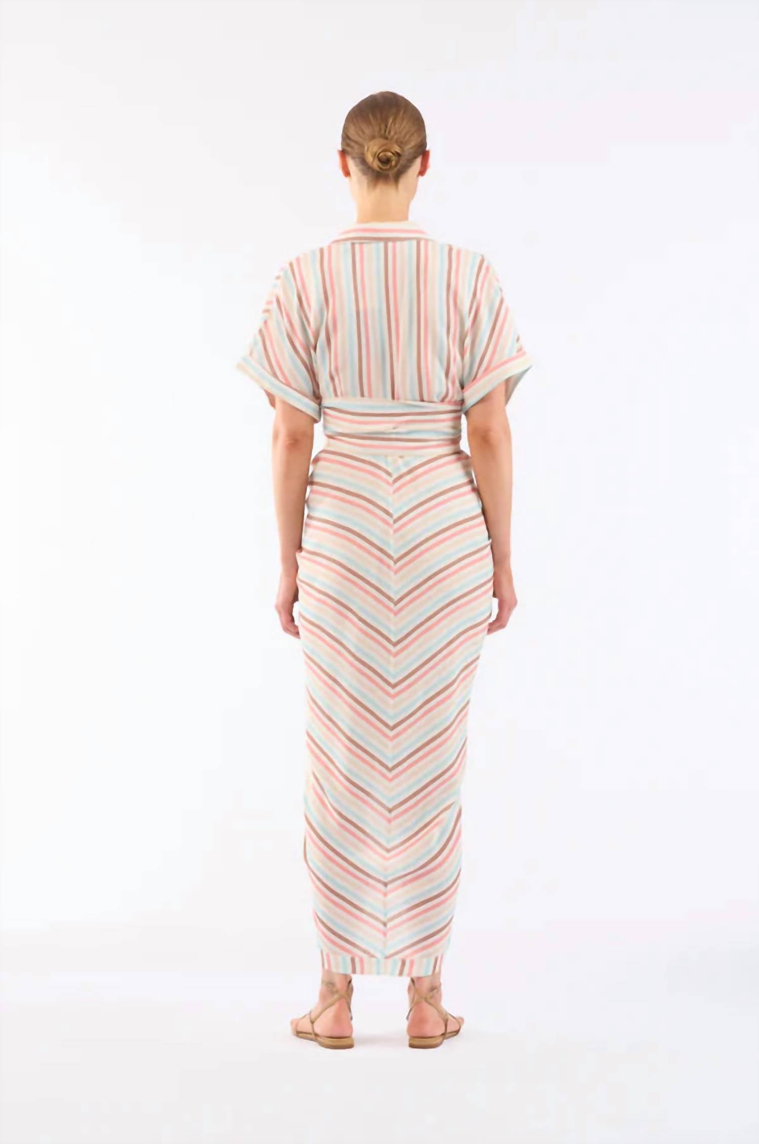 Embrace modern resort glamour with the Miko Dress by LE SUPERBE, featuring short sleeves and a button closure in a stunning Seaside Stripe. Made from 100% Viscose, this A-line midi dress showcases a self-tie belt and ruched skirt for a flattering, fluid silhouette. Perfect for a beach day, the dress combines style with comfort, all in a boho chic trend. Care Instructions: Dry clean only.