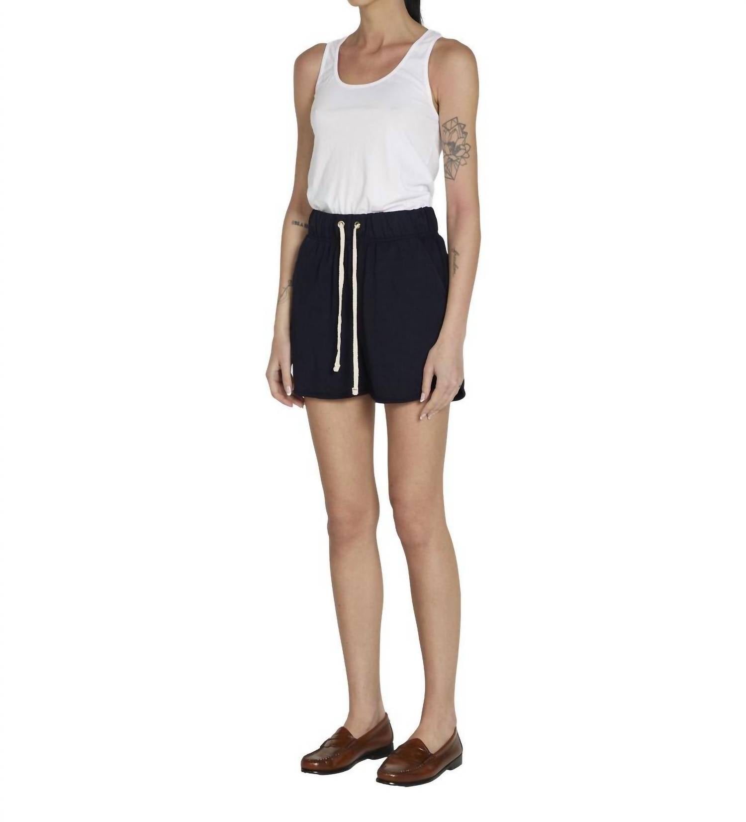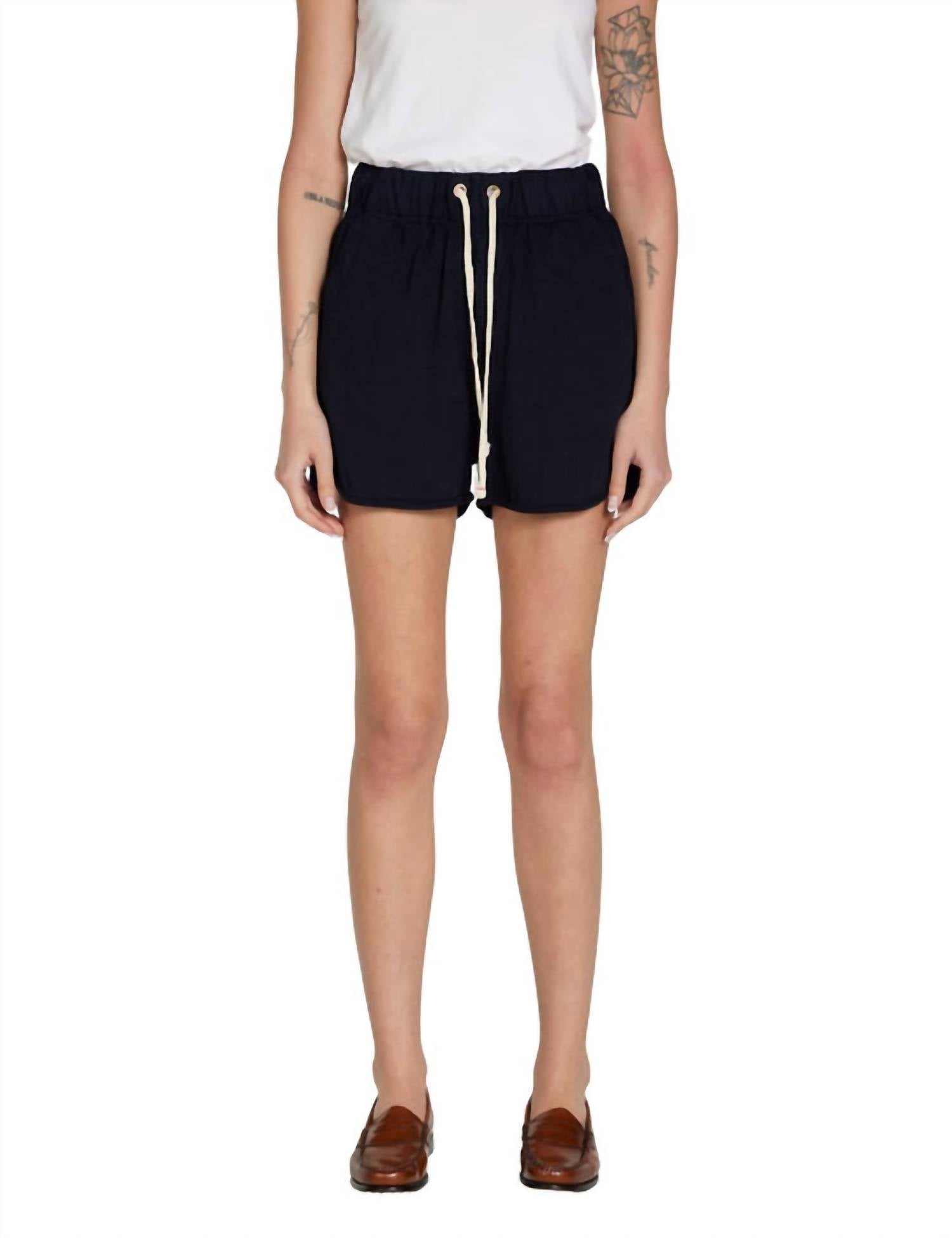 Introducing the Serena Scallop Shorts by LES TIEN, designed for those seeking timeless style in a solid navy finish. Made from 100% cotton vintage structured jersey, these USA-crafted shorts provide a mid-rise relaxed fit that falls elegantly above the knee. Featuring gold Cobrax grommets and exposed outer stitching details, they offer a minimalist appeal perfect for summer holiday parties. Closure: Pull on. Care: Machine wash and tumble dry, ensuring effortless maintenance.