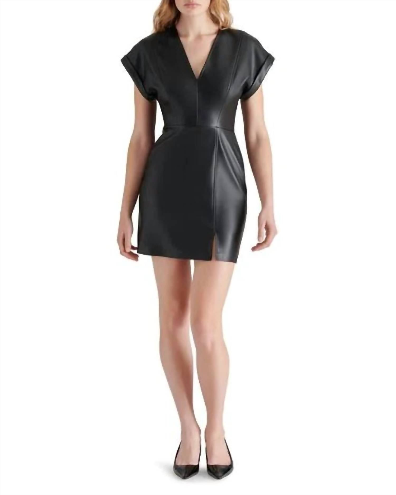Pair with your favorite sandals for an effortlessly chic look. Step out in style with the Roslyn Dress by Steve Madden, a stunning choice for your next night out. This chic bodycon dress features short rolled sleeves, a daring V-neckline, and is crafted from buttery faux leather for a sleek look. With an edgy exposed back-zip closure, it’s tailored to a flattering leggy length, perfect for holiday parties. Composition: 100% Polyurethane. Care: Dry clean or hand wash, dry flat. Color: Black. Imported.