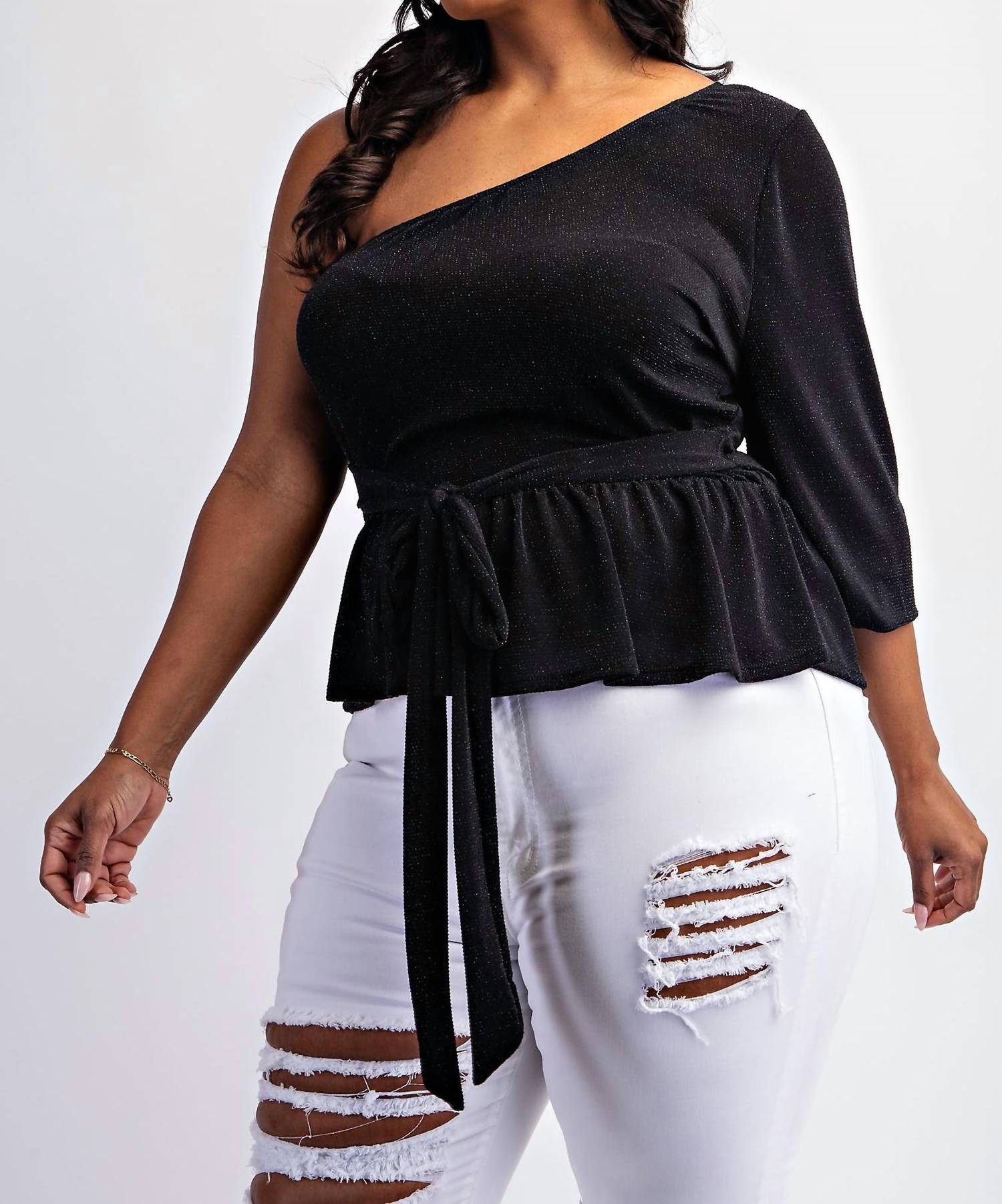 Shimmer in style with The Curve LA's Plus Size One Shoulder Peplum Top in eye-catching green glitter, perfect for evening events or festive gatherings. This top features a flattering peplum silhouette with three-quarter sleeves and a chic tie detail. Crafted with a textured pattern, it boasts a pull-on closure for easy wear. Proudly made in the US, it offers the convenience of machine wash care.