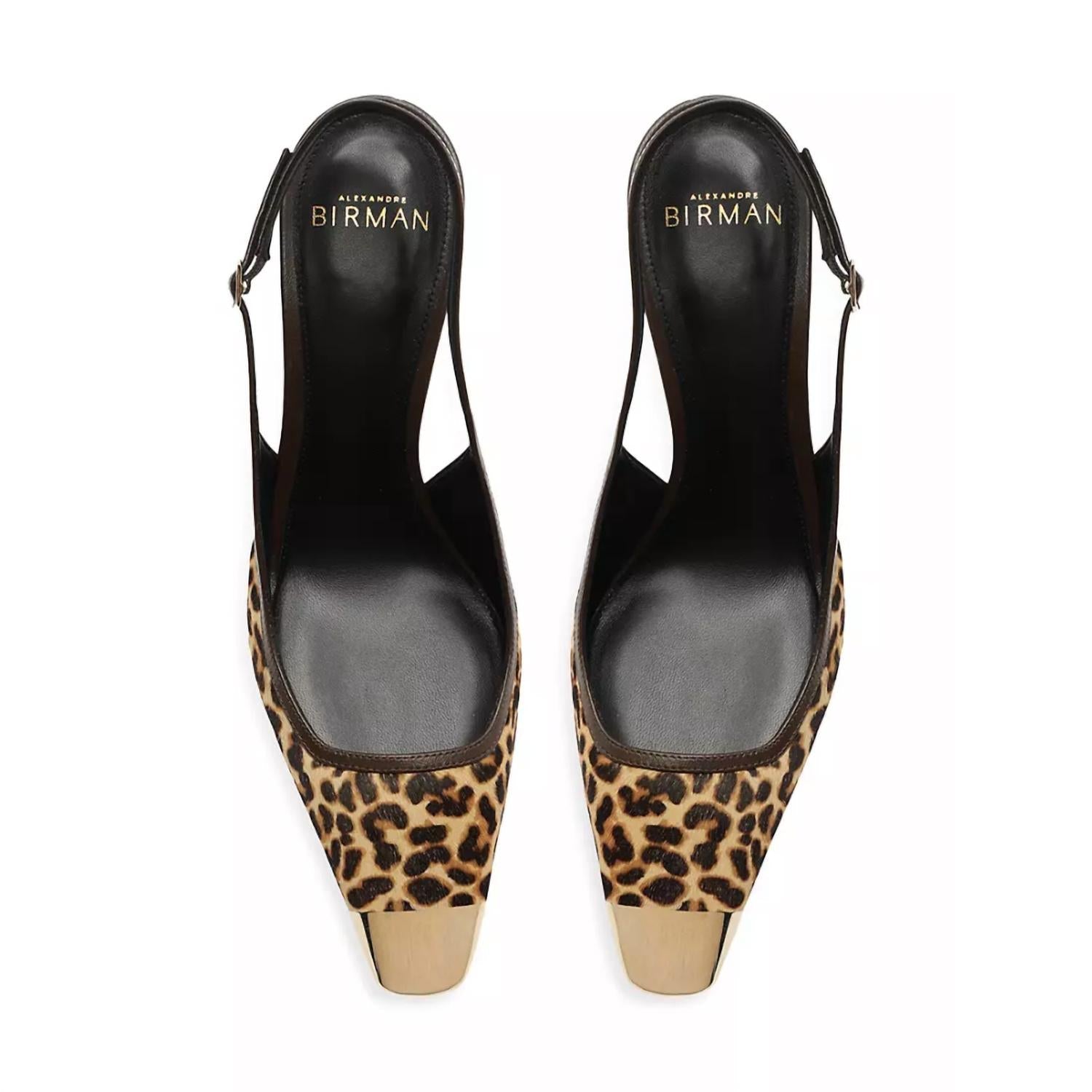 Elevate your ensemble with the Women's Olivia Heels by Alexandre Birman, crafted from luxurious leopard pony and nappa leather. These slingback heels feature a longer square toe combined with a metallic captoe in soft gold, offering a sophisticated and retro charm. At a heel height of 3.4 inches (85mm), they exude an elegant allure perfect for dinner parties or New Year's Eve celebrations. Embrace classic style with the adjustable slender strap, ensuring a secure fit for every occasion.