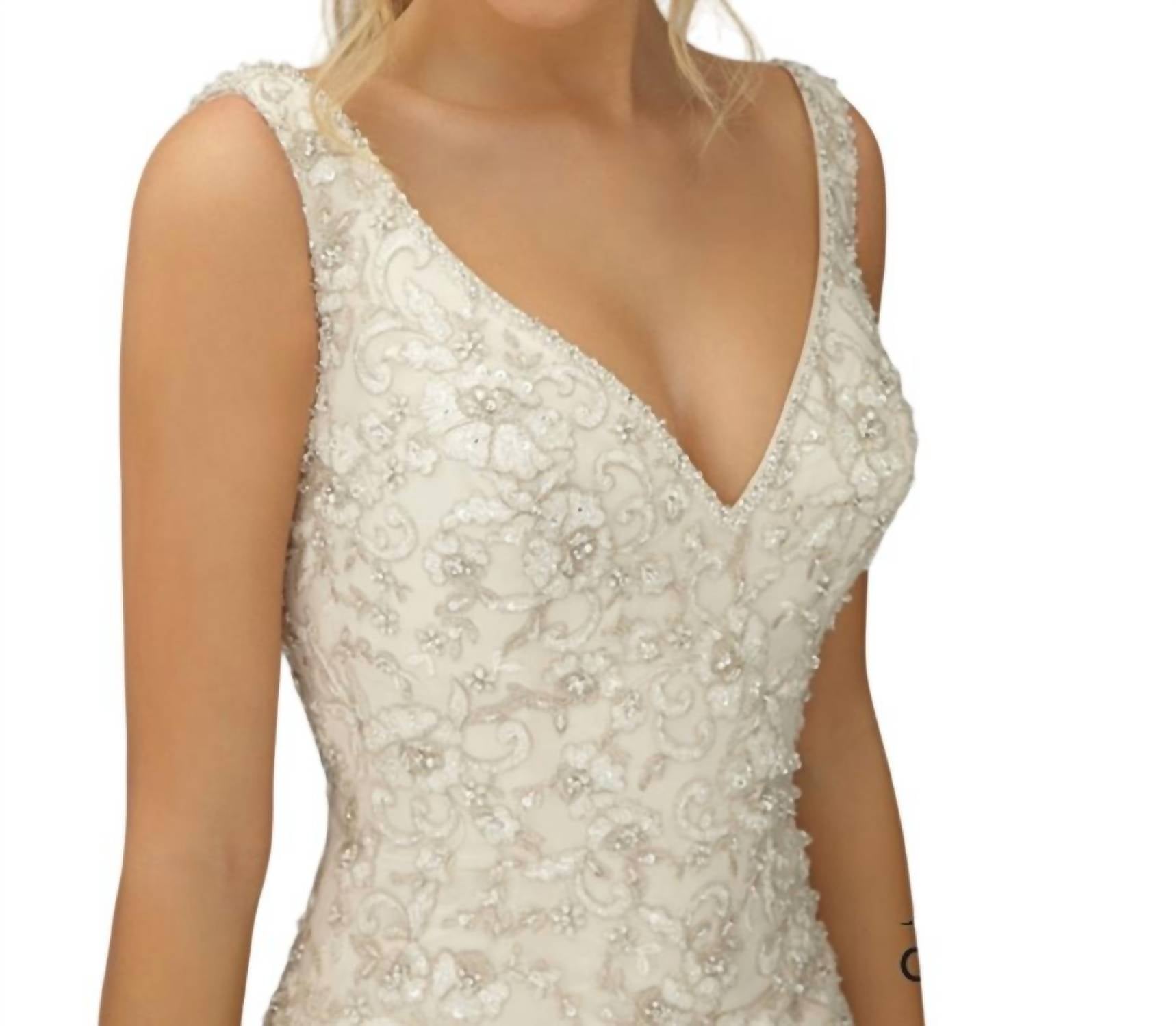 Embrace timeless elegance with the Trump All Over Bead Dress by Angelina Faccenda, a captivating choice in ivory for any wedding setting. This sleeveless masterpiece showcases exquisite lace and hand-woven embroidery crafted with silk thread, beautifully designed for a flattering fit. Closure: Button closure. Approximate Measurements: 38" bust, 29.5" waist, 41.5" hips, and 61" hollow to hem. Perfect for spring occasions, this solid-patterned dress features a classic V-neckline that accentuates its romantic style.
