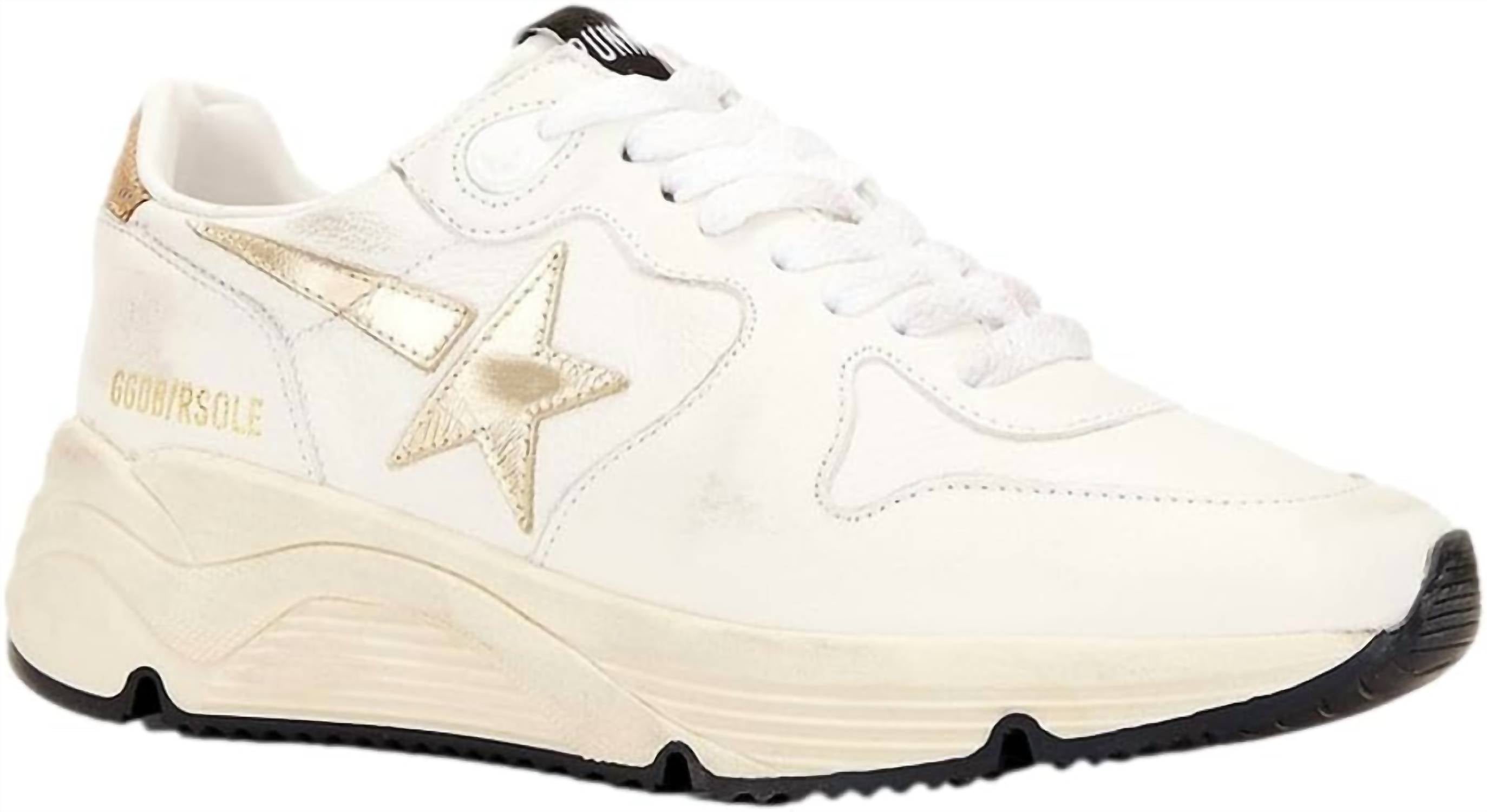 Introducing the Women's Running Sole Shoes by GOLDEN GOOSE, a chic fusion of streetwear trend in a white, gold, and beige palette. Crafted from luxurious leather, these sneakers feature a round toe design and a flat heel, perfect for summer vacations or casual outings. Ideal for the style-conscious adult woman looking for comfort and contemporary flair.