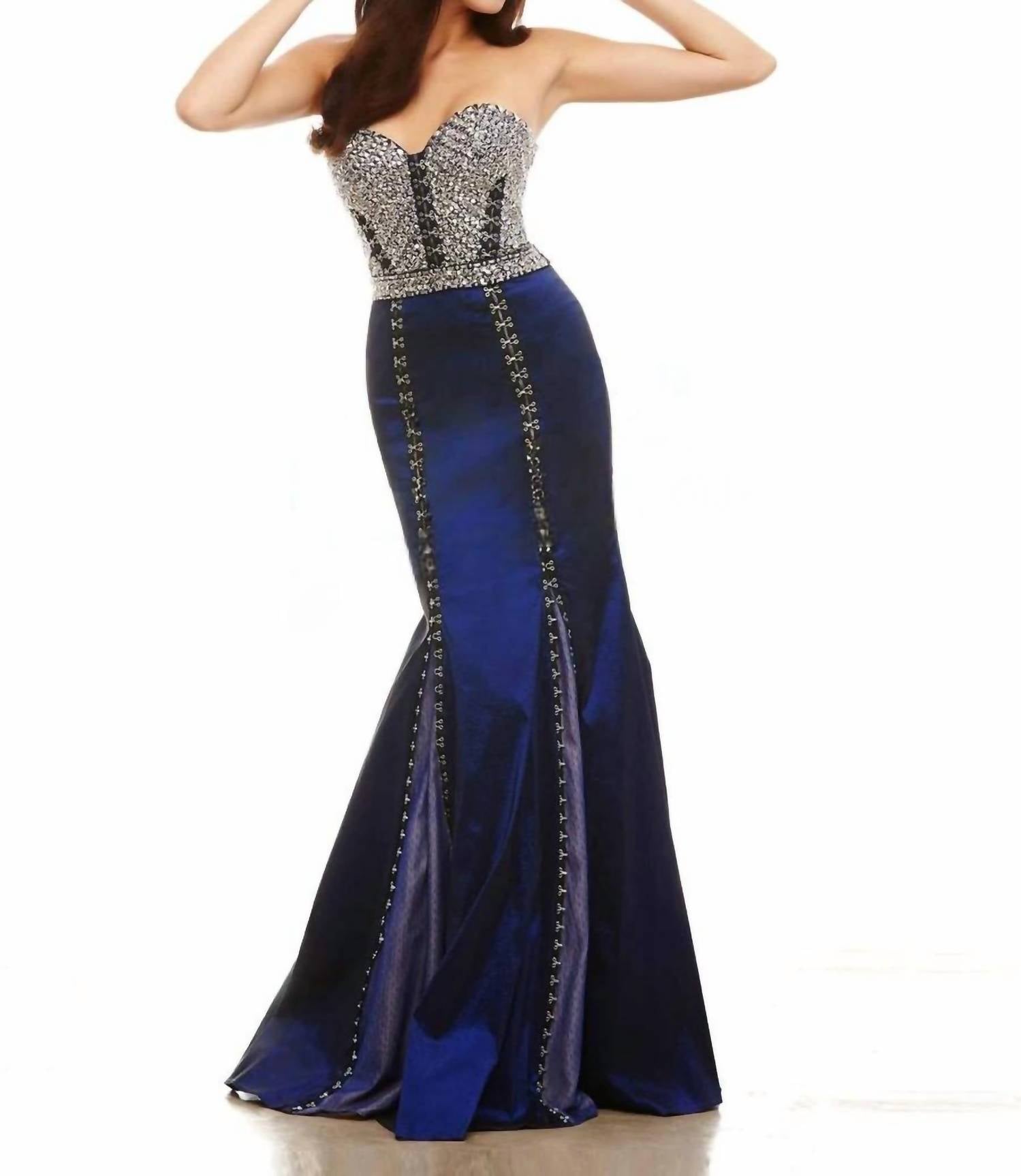 Introducing the Embellished Sweetheart Neck Evening Gown by MAC DUGGAL, a stunning choice for your special occasions. This strapless mermaid silhouette gown in midnight features intricate rhinestone embellishments, adding a touch of sparkle to your ensemble. The dress offers a flattering sweetheart neckline and secure zip closure. Perfect for a prom night to remember.