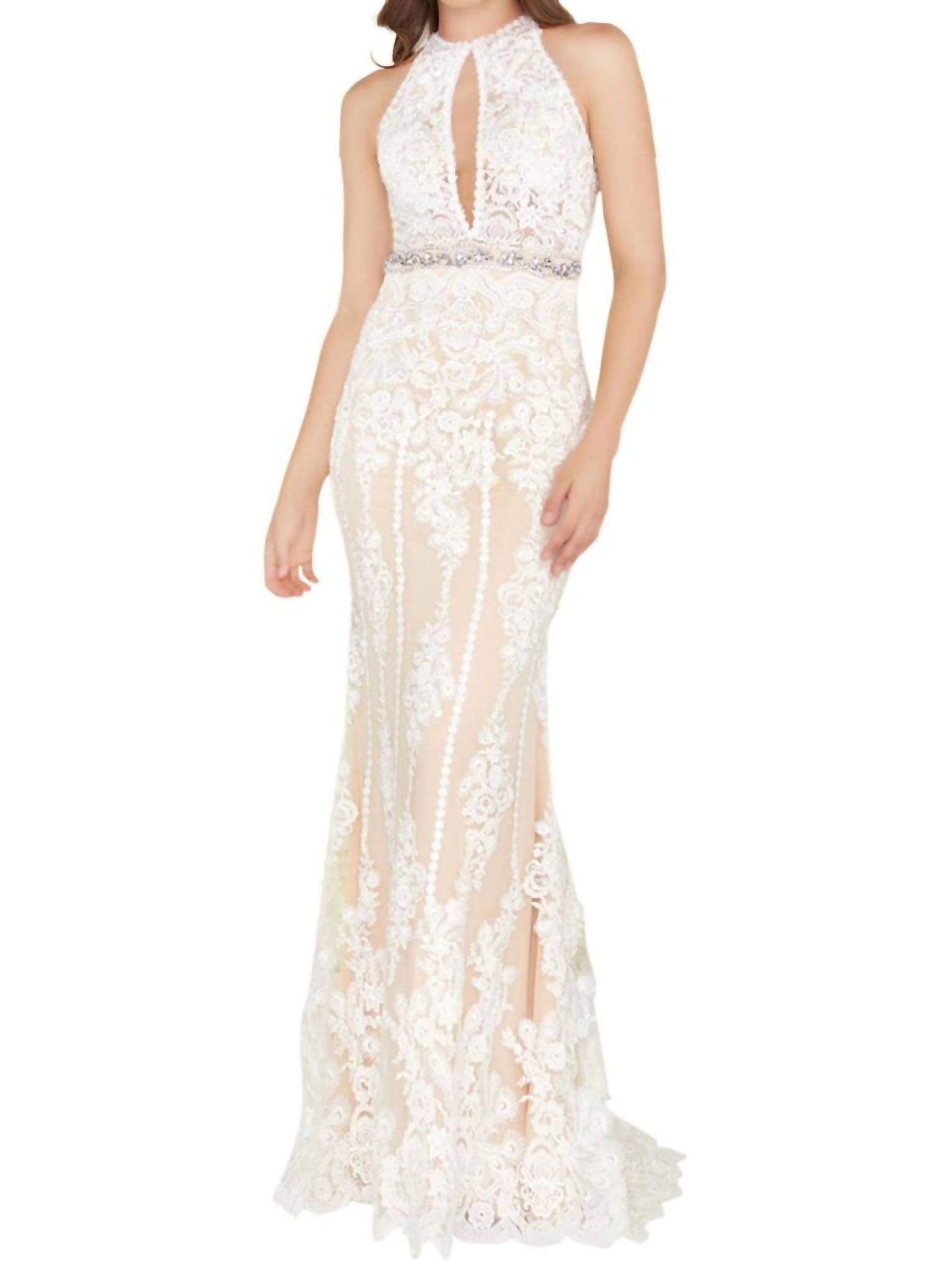 Basta adicionar uma linda clutch e um salto combinando para o look perfeito para o evento. Apresentamos o Risque Sheer Embroidered Gown da MAC DUGGAL, uma escolha deslumbrante para o baile de formatura em uma paleta atemporal de tons marfim/nude. Este vestido sem mangas exibe costas abertas cativantes, com o charme de um corpete adornado com joias e uma saia transparente bordada. Confeccionado em um corte justo e elegante, o vestido é realçado por um cinto incrustado de cristais e apresenta um decote halter com decote em V para maior elegância. O fechamento é feito por um zíper sem costura, complementando perfeitamente esta criação requintada.