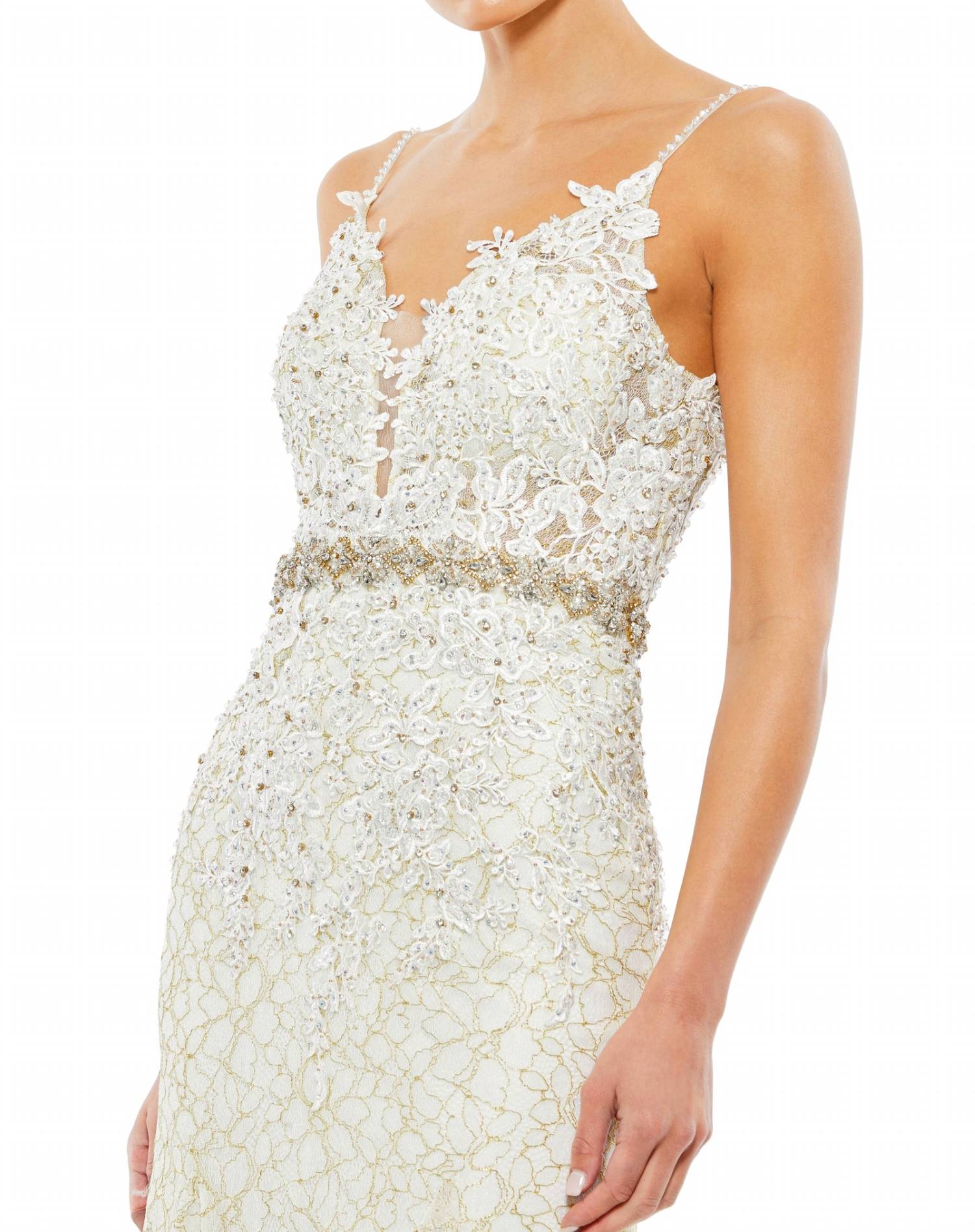 O vestido formal Trumpet com decote profundo da Mac Duggal é uma escolha requintada para um casamento. Apresenta um design sem mangas com um decote que se estende elegantemente em V, exibindo um belo equilíbrio entre cobertura e charme. Confeccionado em 100% poliéster com bordados florais intrincados e detalhes em pedraria na cintura, mede aproximadamente 162,5 cm de comprimento e inclui uma cauda ampla para um acabamento dramático. O vestido também possui um zíper invisível nas costas, destacando o material texturizado e mantendo a cor marfim imaculada.