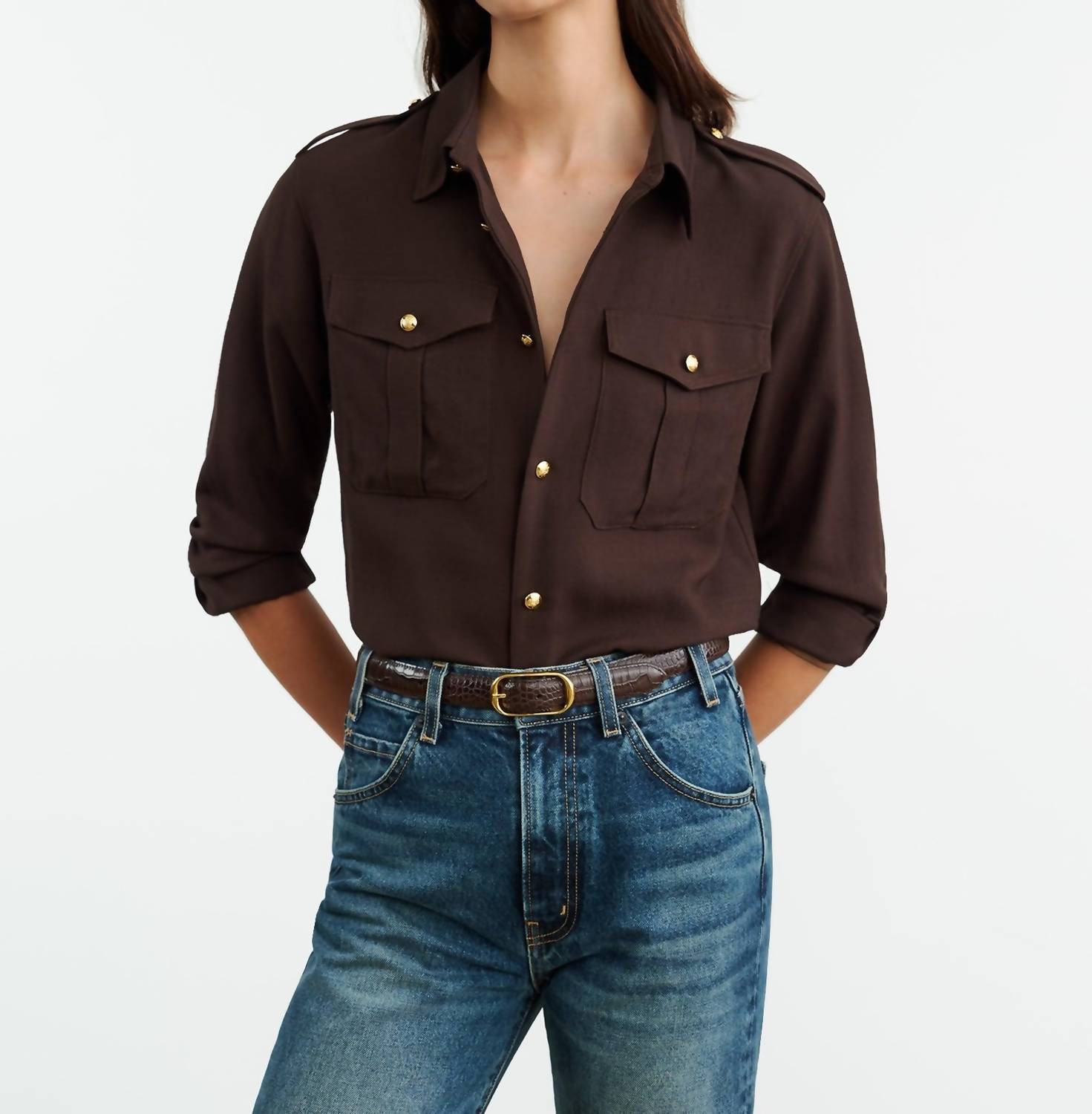 Uma camisa clássica de botões que nunca sai de moda. Eleve seu guarda-roupa com a blusa Jeanette da NILI LOTAN, uma peça básica e sofisticada confeccionada em 100% lã virgem. Esta camisa de manga comprida, com corte reto e botões, é confeccionada em lã italiana e apresenta luxuosos botões dourados com o brasão exclusivo para um toque de opulência. Com práticos bolsos de aplicação plissados ​​com aba no peito, gola padrão e dragonas clássicas, ela personifica uma elegância atemporal. O fecho de botão a torna versátil e fácil de usar em qualquer ocasião.