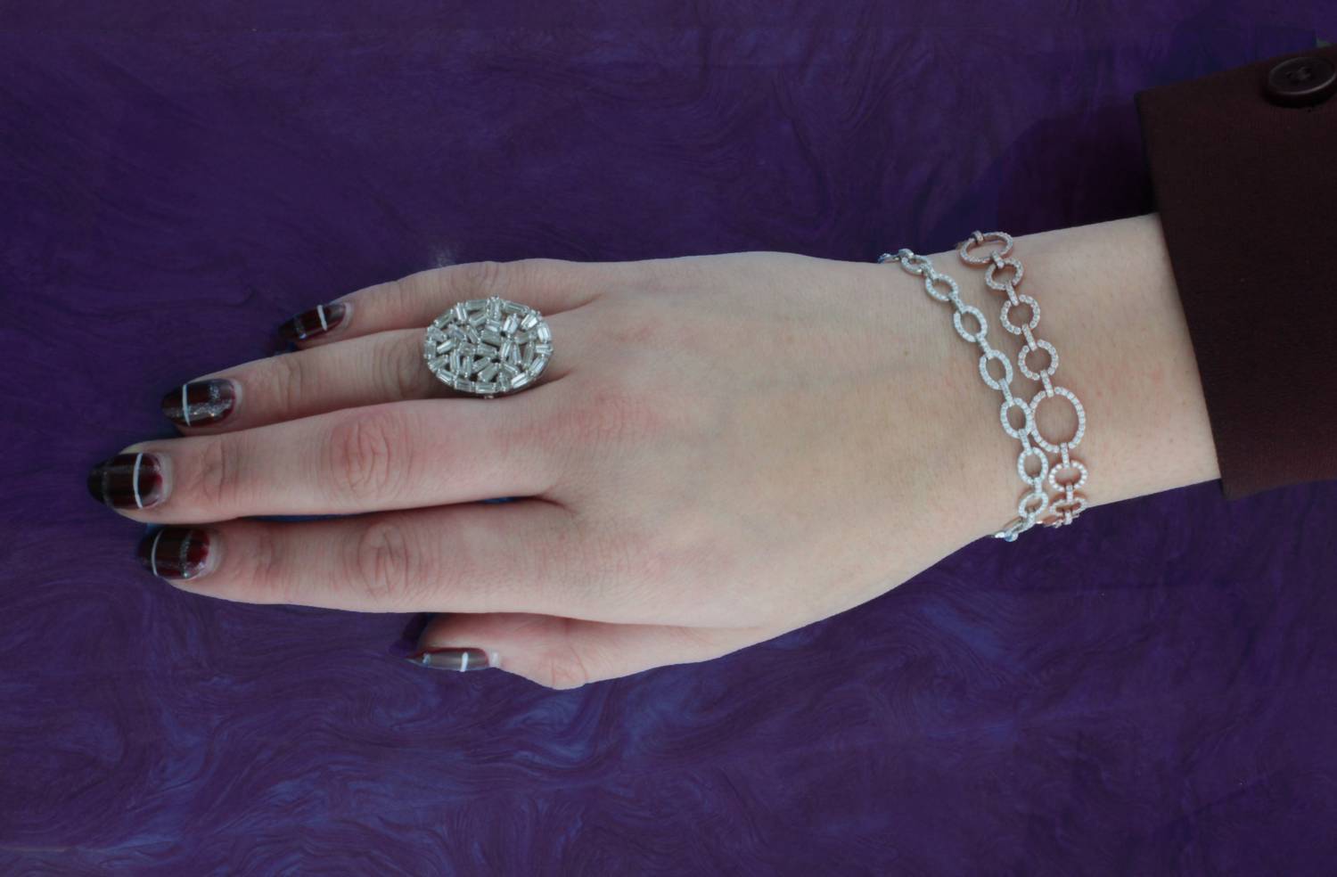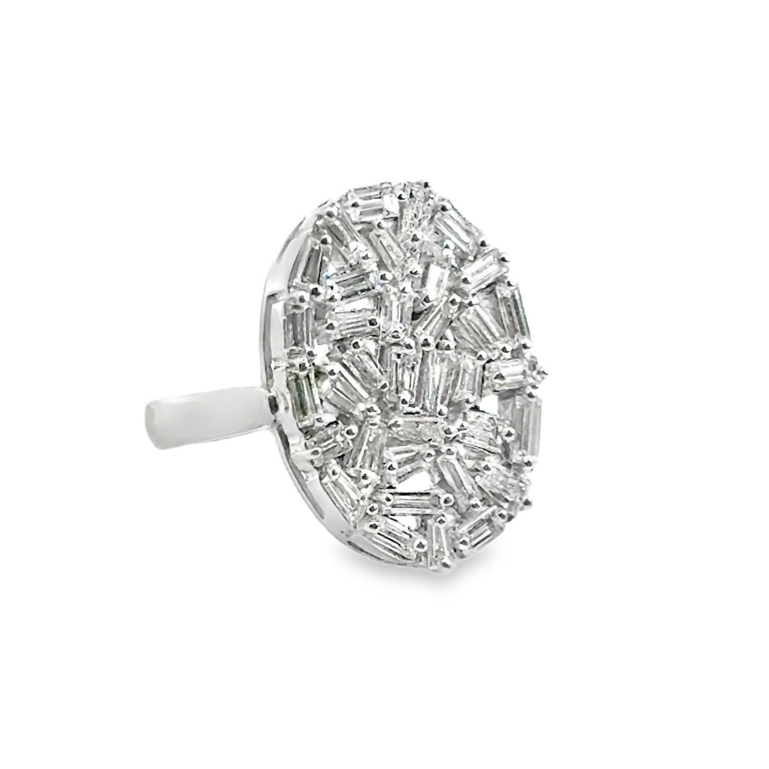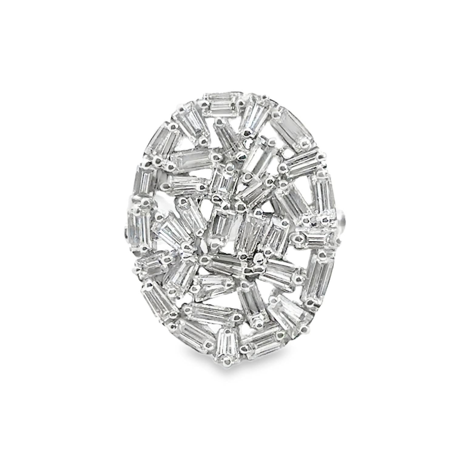Discover the elegance of Normani's Women's Baguette Diamond Fashion Ring, crafted from stunning 14-karat white gold and adorned with 3.37 carats of natural diamond baguettes arranged in an asymmetric oval shape. The diamonds are colorless, falling within the premium D-F color grade range, offering pristine clarity and brilliance. This fine jewelry piece can be sized to fit perfectly, and it features a secure push back clasp. Ideal for those with an April birthstone, this exquisite ring showcases the beauty of premium white diamonds in a timeless design.