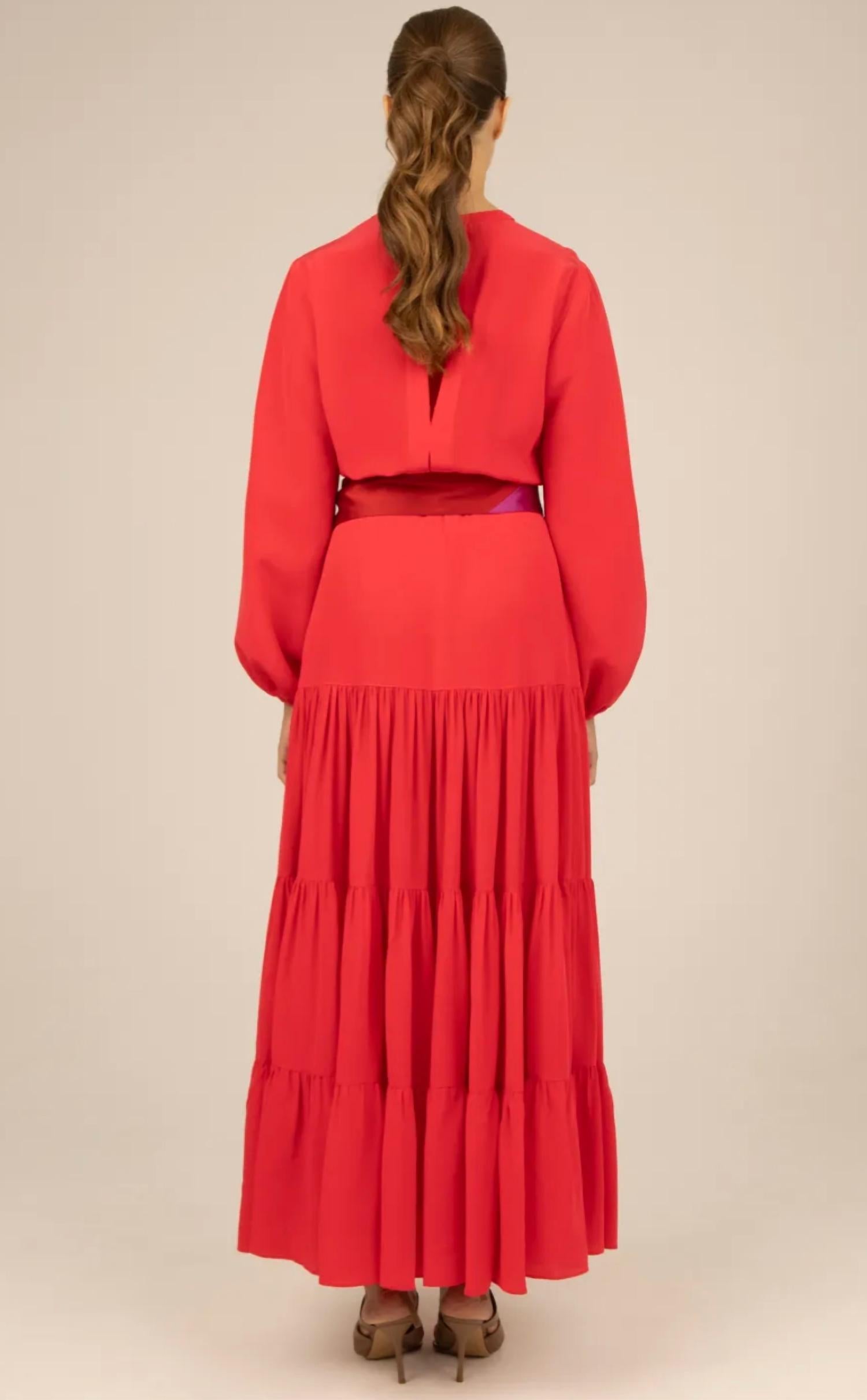 Um vestido longo que é tão fofo quanto confortável. Fluindo suavemente do decote em V para um design em camadas, este vestido longo boêmio apresenta um cinto grande com uma fivela O-ring marcante. Composição: 100% seda. Cor: magenta. Caimento: fiel ao tamanho.