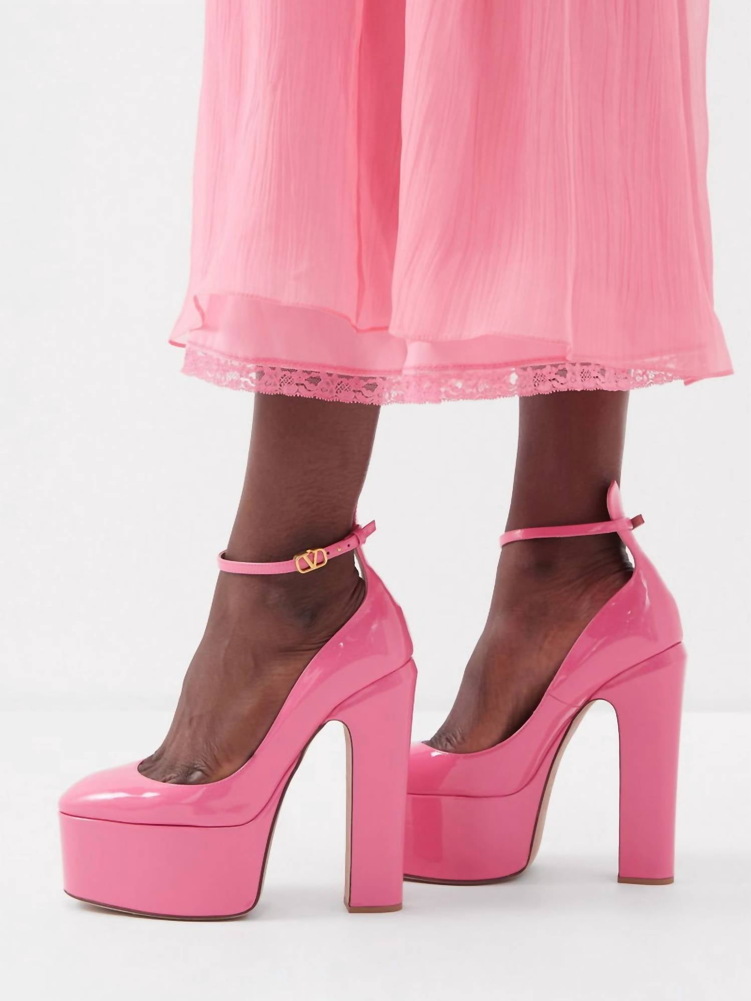 Step into elegance with the Women's Tan-Go Leather Heels by Valentino. Crafted from exquisite leather, these pumps feature a round toe design and a high platform heel measuring 6.1 inches, paired with a 2.2 inches platform for added comfort and height. Complete with an adjustable ankle strap adorned with the iconic VLogo Signature buckle, these heels seamlessly blend style and sophistication. Made in Italy, they embody the essence of preppy trendsetting fashion.
