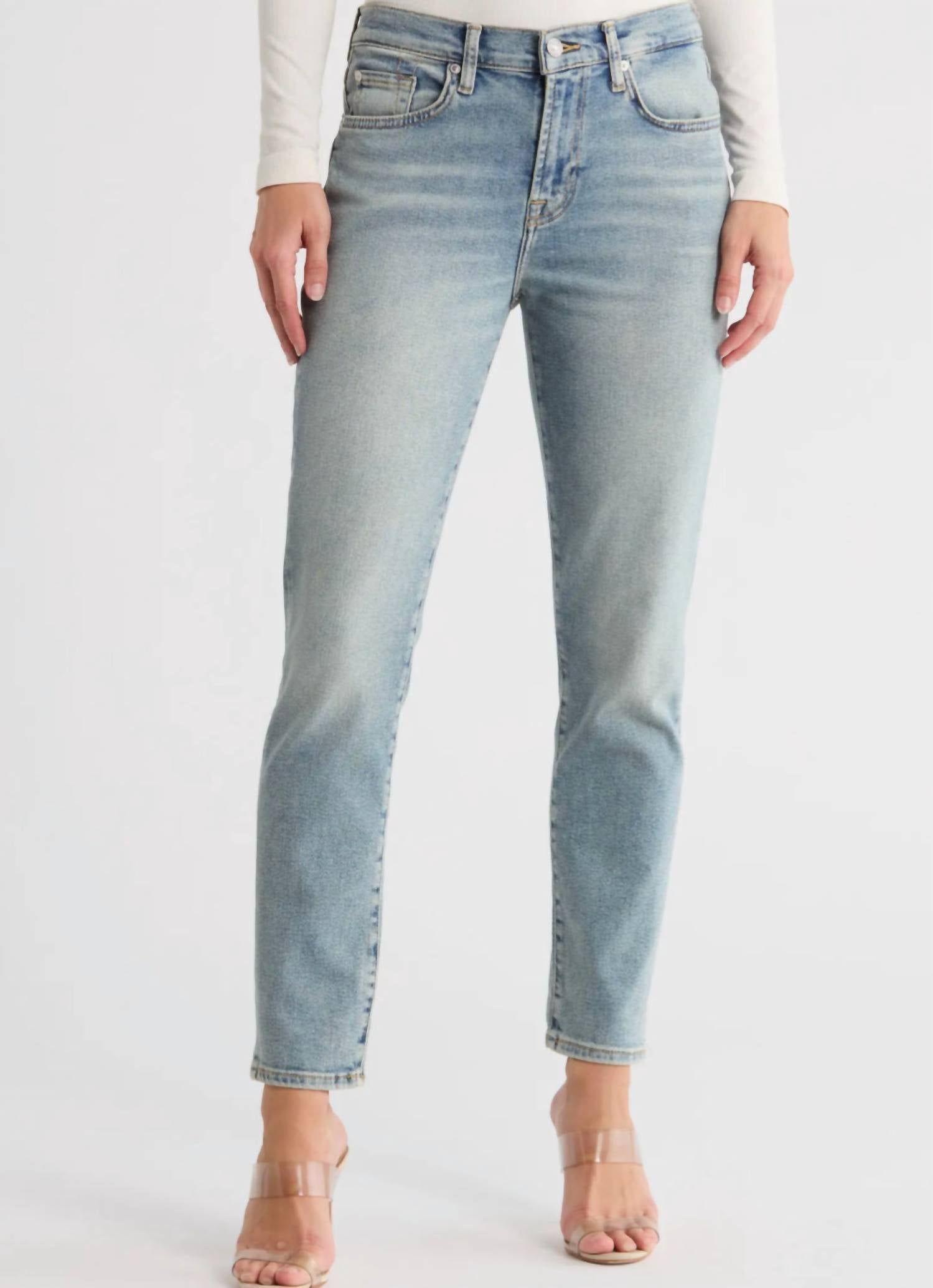 Fit to perfection, we love these high-waist jeans and you will too. Introducing the Josefina High Waist Ankle Boyfriend Jeans by 7 For All Mankind in the stylish 'Amuse Me' color. These medium wash jeans feature a high-rise waist and are crafted from a cotton blend for ultimate comfort and flexibility. With a 25.5" inseam and a 10" front rise, they offer a flattering slim fit through the skinny leg style, complete with a button closure. Care for them easily with machine wash and lay flat to dry instructions.