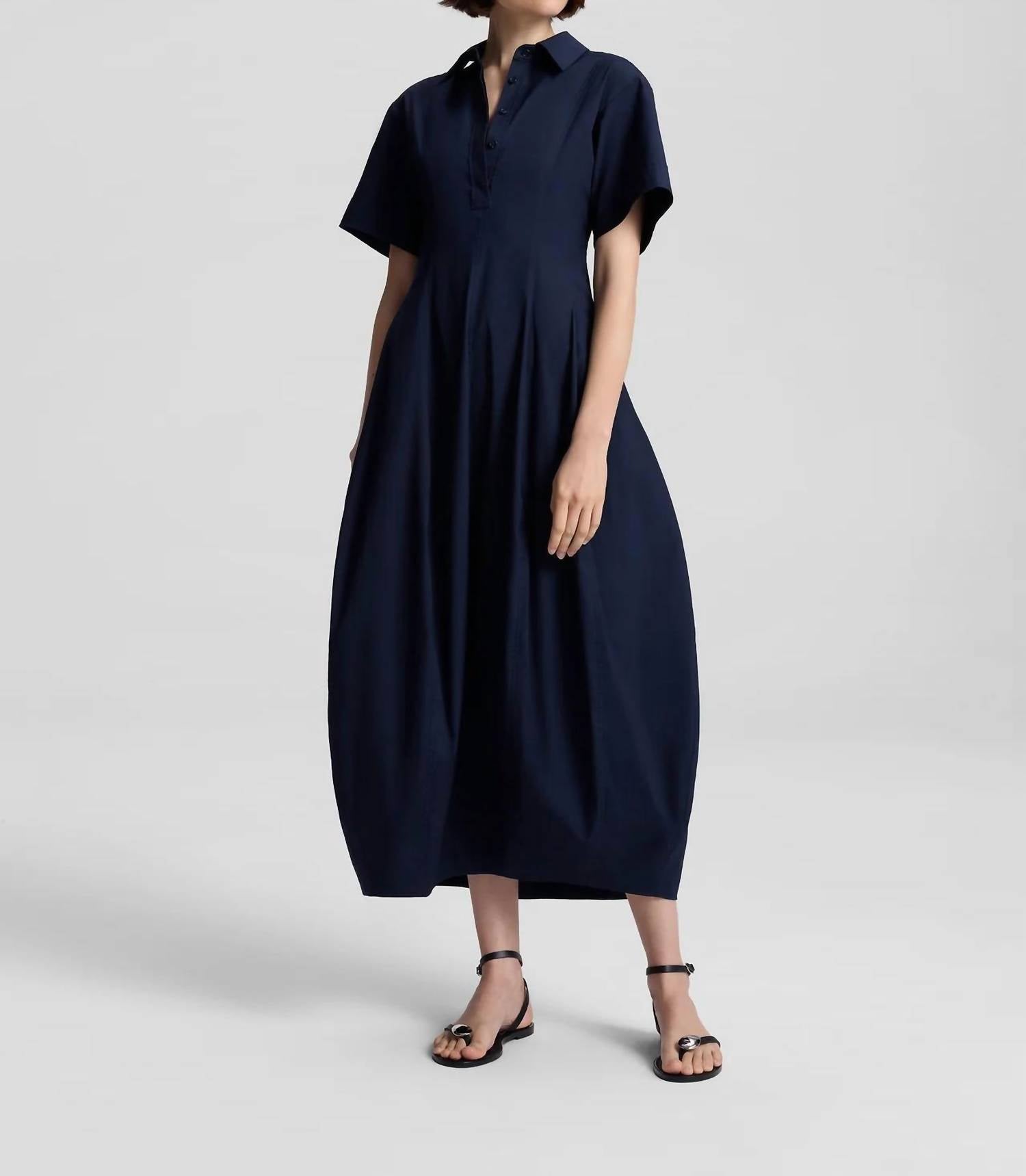 Introducing the Della Stretch Cotton Midi Dress by A.L.C., a sophisticated evening blue piece perfect for the fashion-forward woman. This short-sleeve shirtdress is crafted from a 97% cotton and 3% elastane blend, offering a comfortable yet structured fit. Designed with a sharp collar and a zip closure, its 52.25" length skirt features sculptural volume complemented by vertical seams, while the seamed waist accentuates a sculpted fit. Care instructions: dry clean. Model is 5'10" and wears size 4 (Bust 30", Waist 23", Hips 34"), with product measurements for size 4: Bust 33.25", Waist 29.5", Hips 40".